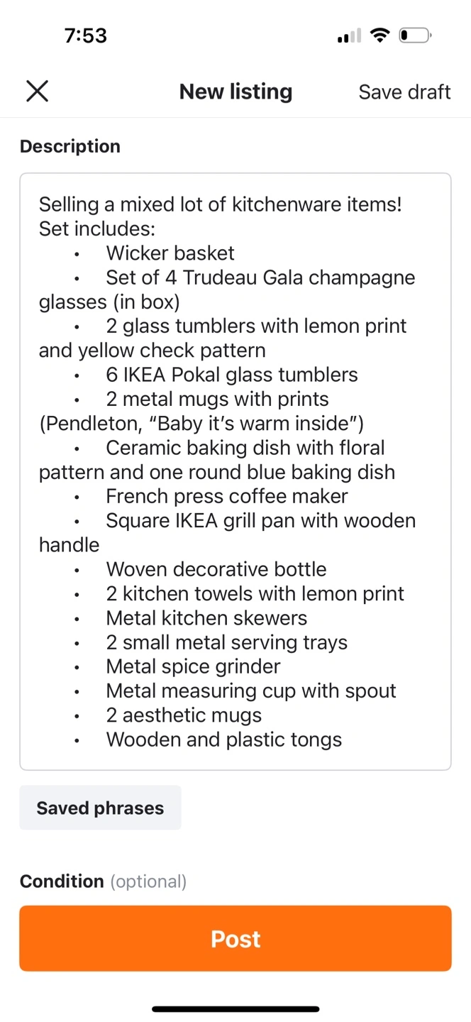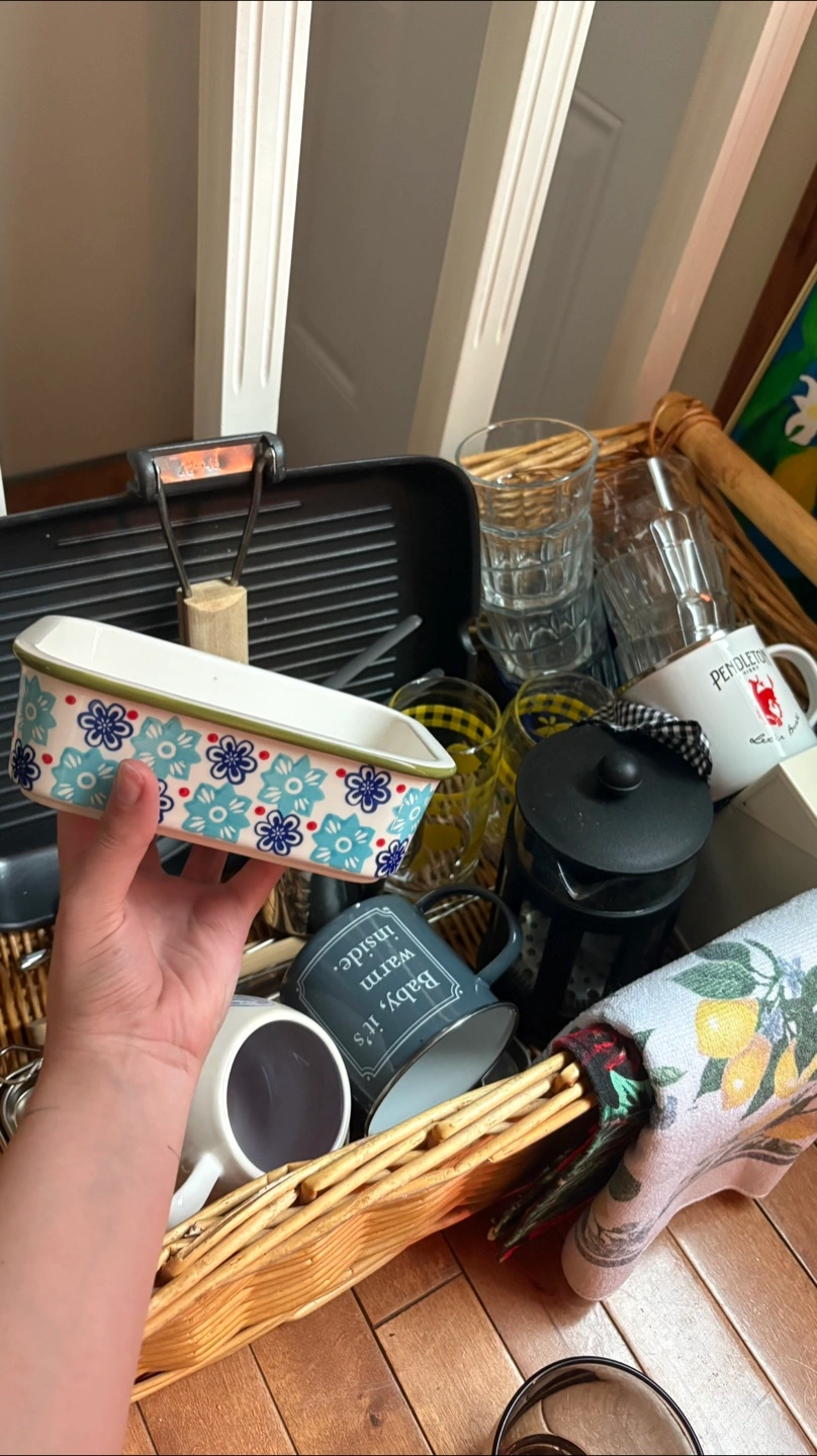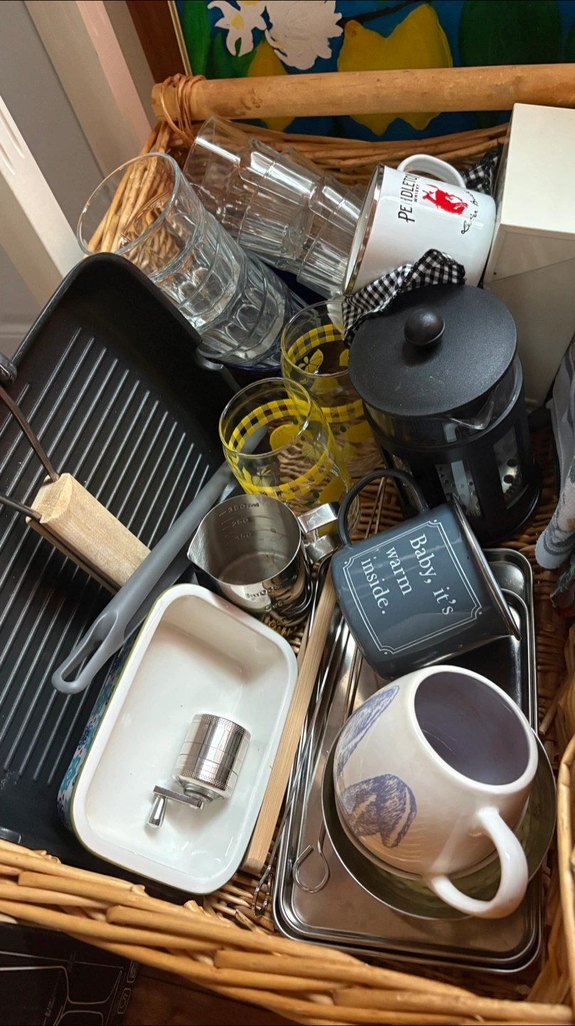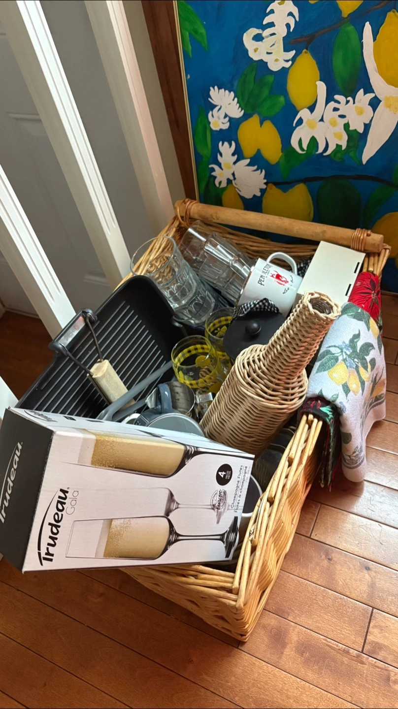 Selling a large basket filled with kitchenware — all items are new or in excellent condition. check the last picture