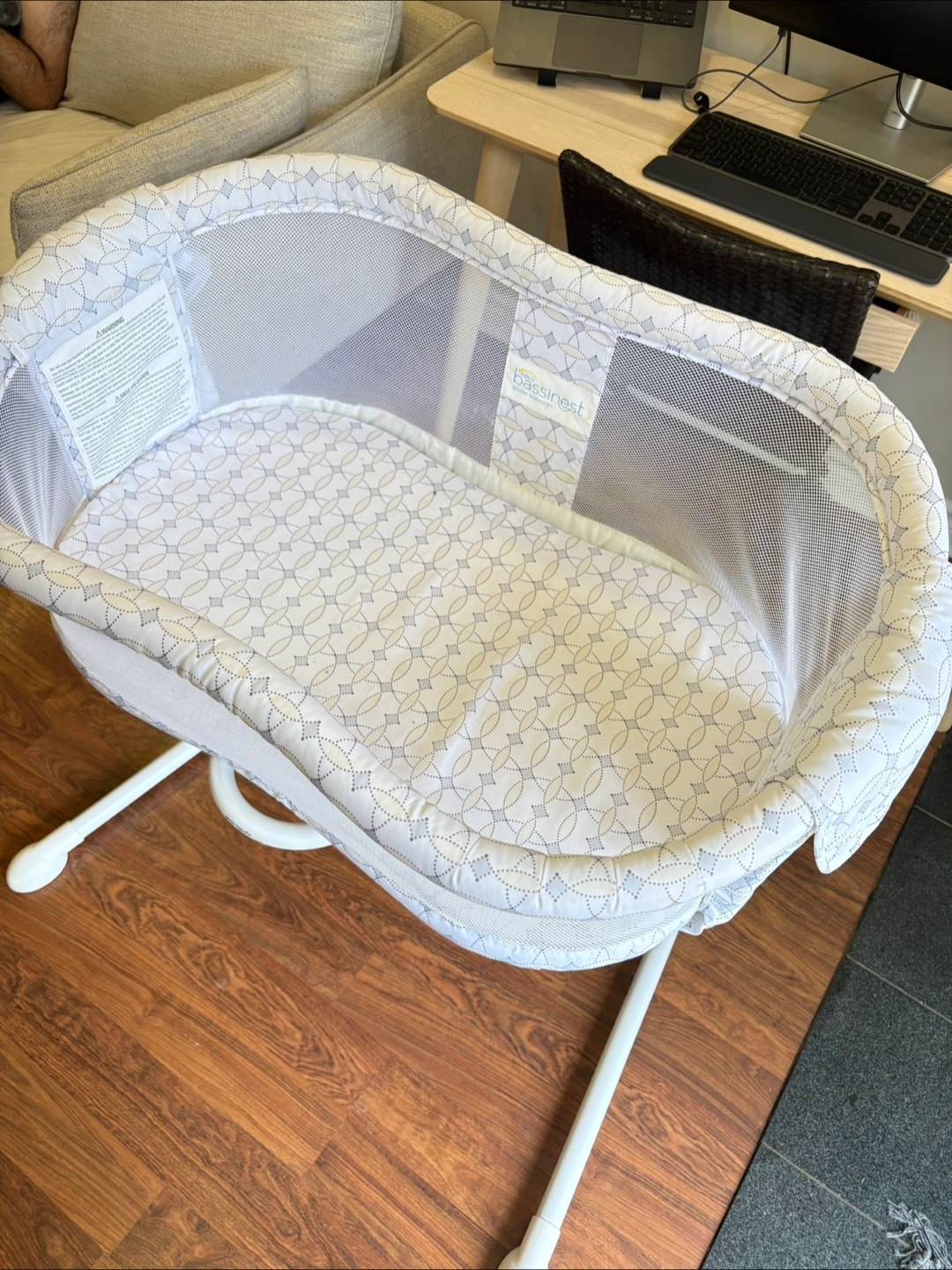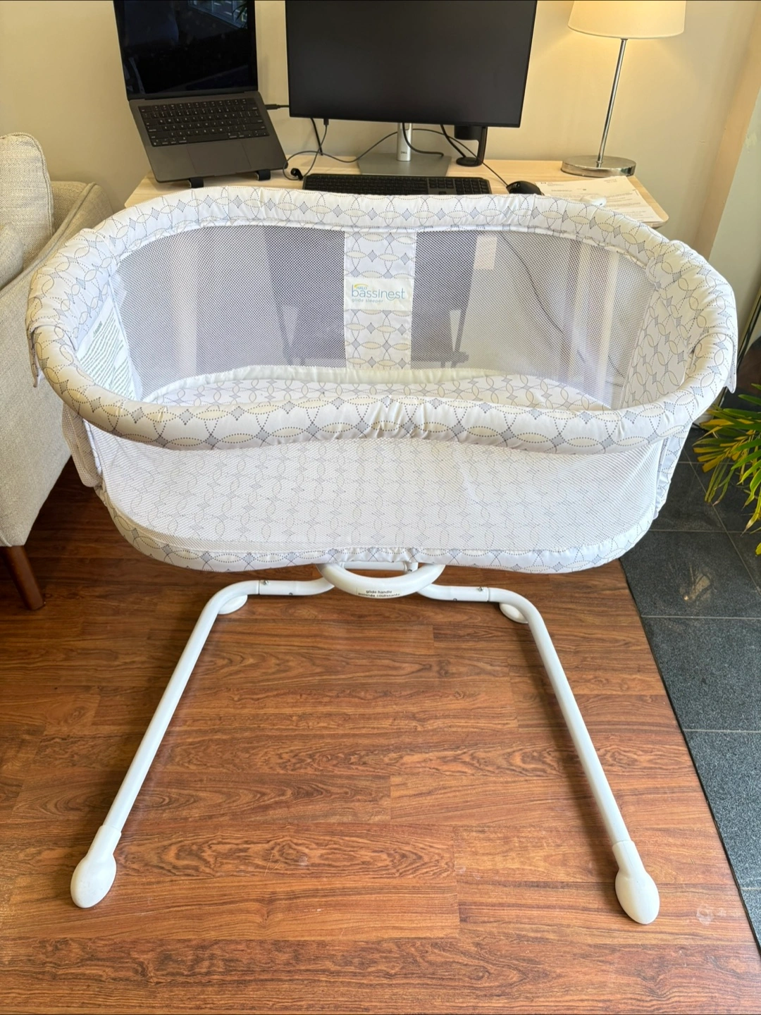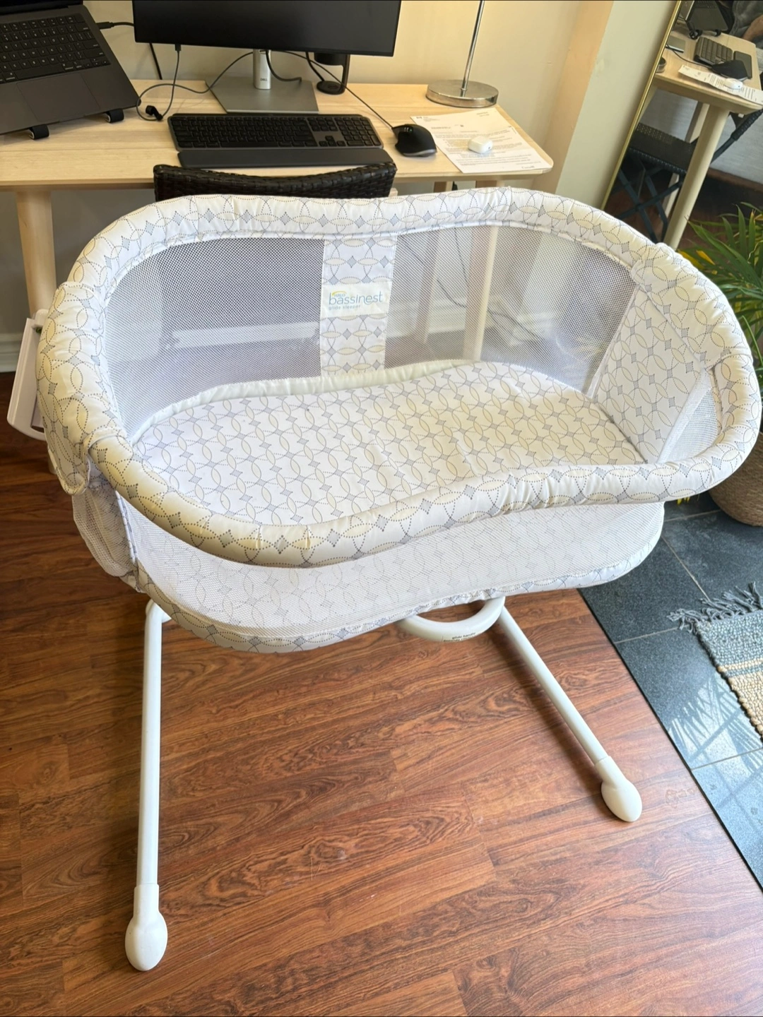A baby bassinet. Features a white base and mesh siding. Interior with a patterned material. The HALO® BassiNest® Glide sleeper is the only bassinet that glides easily across any floor surface, including carpet.
