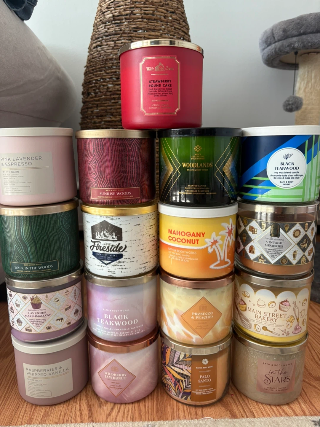 I have a selection of Bath & Body Works candles available! They come in a variety of lovely scents, including: - Strawberry Pound Cake - Pink Lavender & Espresso - Sunrise Woods - Woodlands - Black Teakwood - Walk in the Woods - Fireside - Mahogany Coconut - Vintage Memories - Lavender Marshmallow - Raspberries & Whipped Vanilla - Wildberry Jam Donut - Prosecco & Peaches - Palo Santo - Main Street Bakery - In the Stars Perfect for creating a cozy atmosphere Looking to sell as a lot, may consider separating