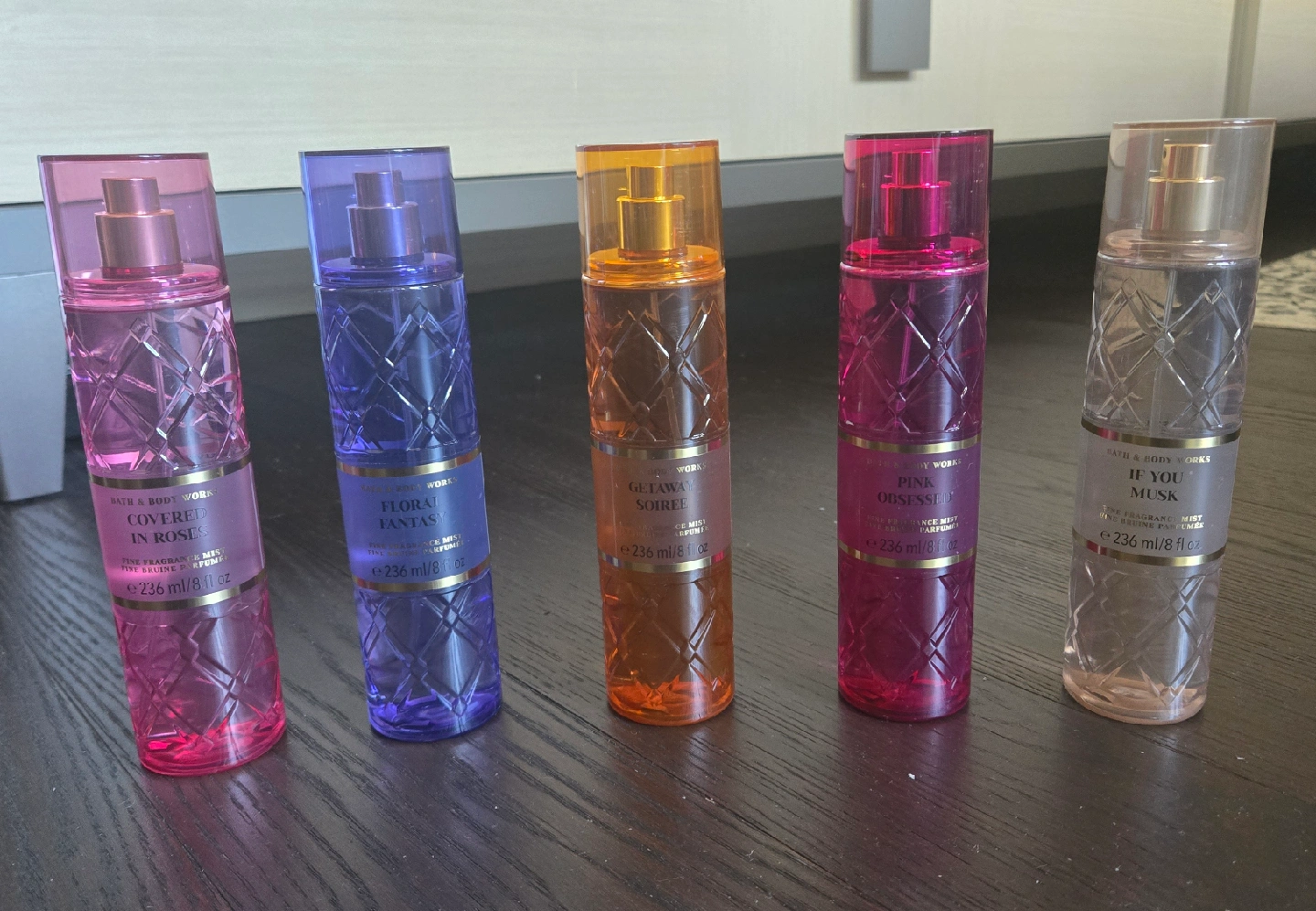 Selling a bundle of Bath & Body Works Fine Fragrance Mists! Includes the following scents: - Covered in Roses - Floral Fantasy - Getaway Soiree - Pink Obsessed - If You Musk Each bottle contains 236 ml / 8 fl oz $10 each ot all 5 for $40 prices are firm