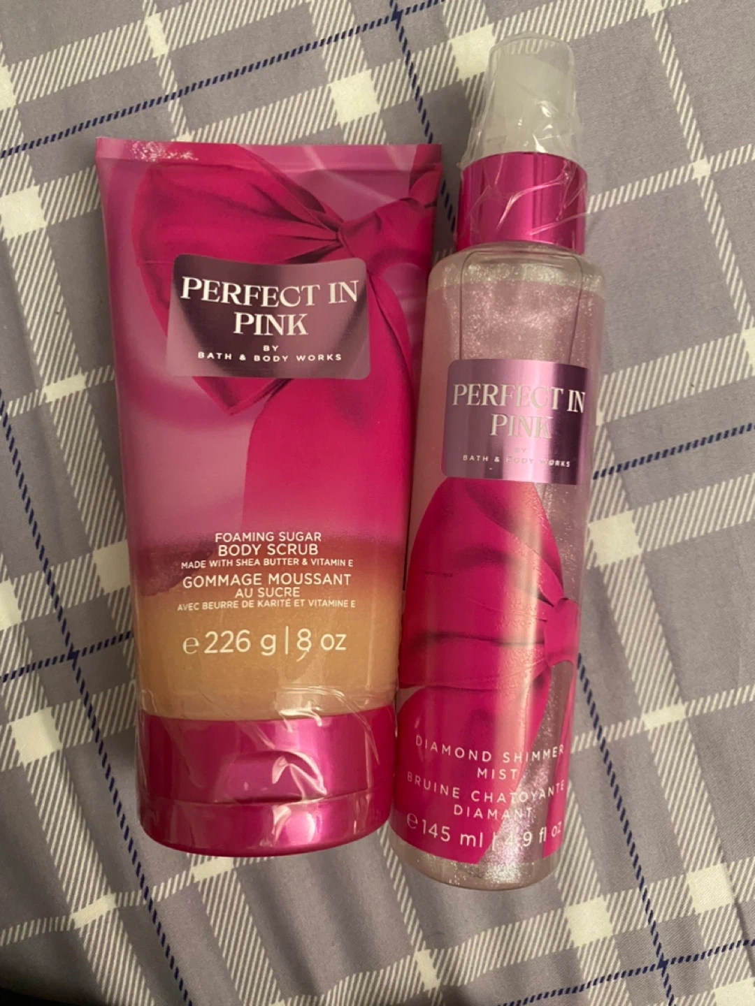 Selling a Bath & Body Works 'Perfect in Pink' set! It includes: - Foaming Sugar Body Scrub (226 g / 8 oz) - Diamond Shimmer Mist (145 ml / 4.9 fl oz) Both items are new and in excellent condition!