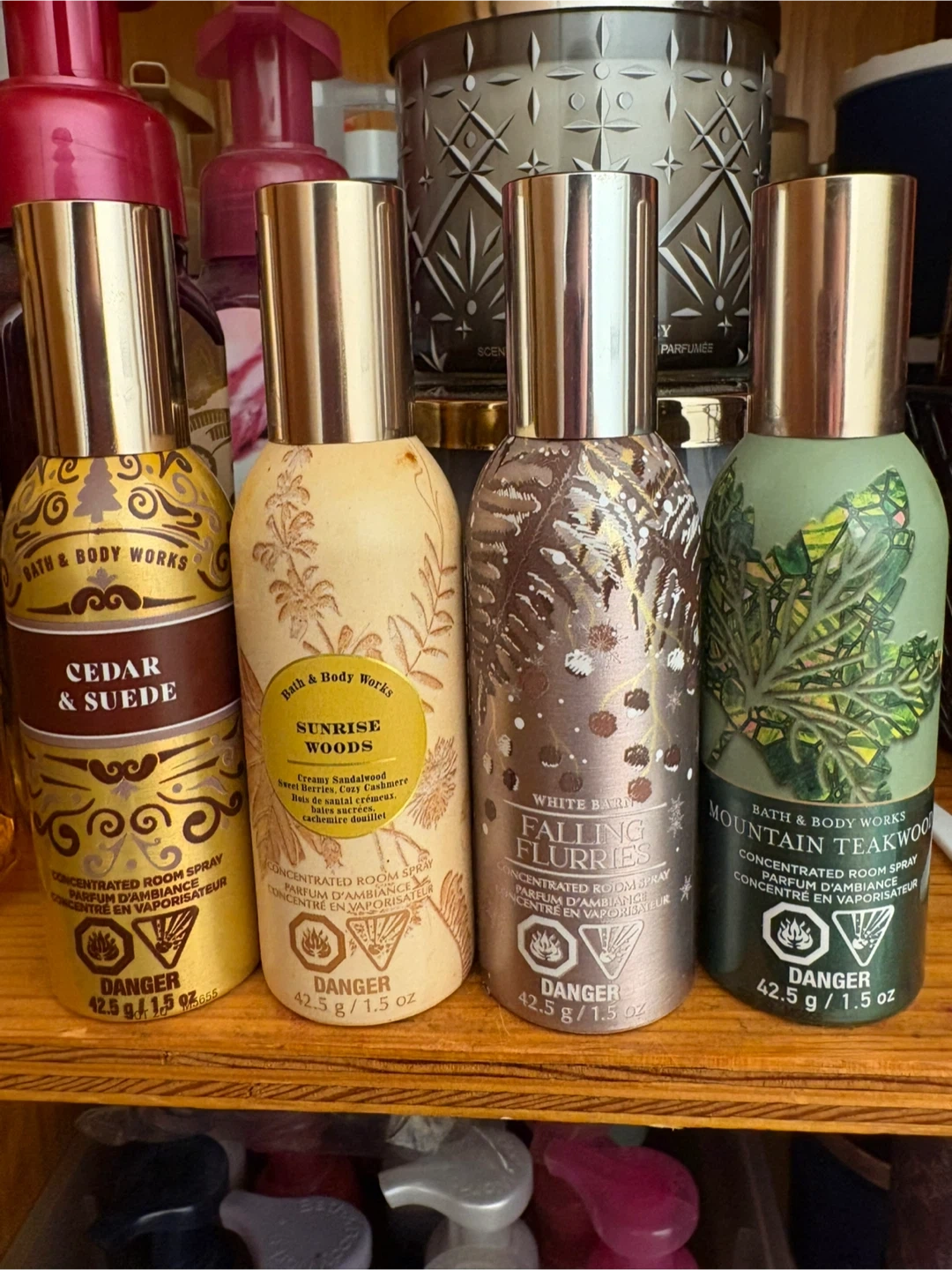 Selling a bundle of NEW Bath & Body Works concentrated room sprays! Includes Cedar & Suede, Sunrise Woods, Falling Flurries, and Mountain Teakwood. Perfect for freshening up any room!