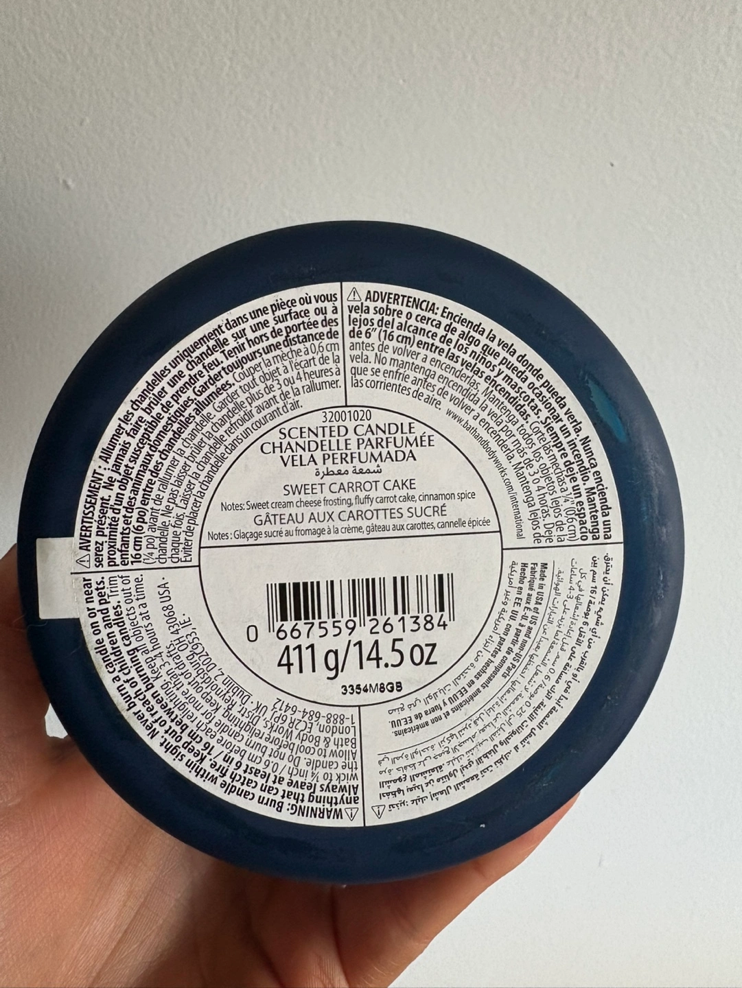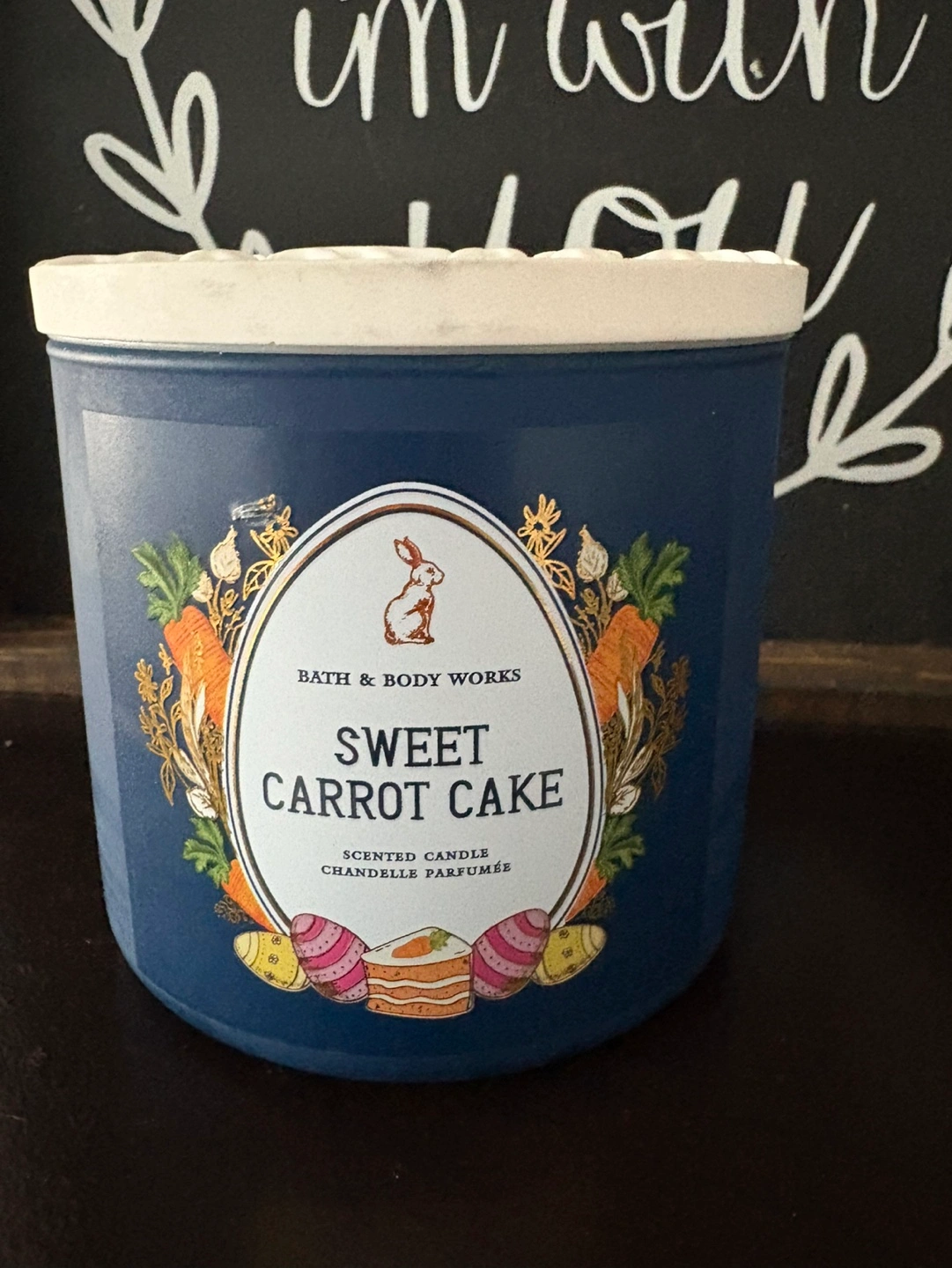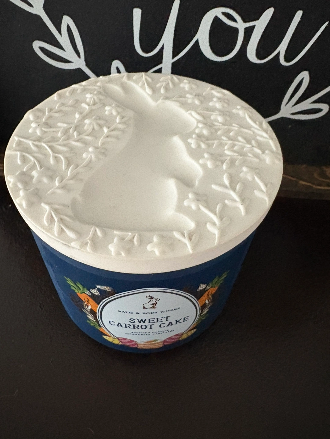 Large jar candle. Sweet Carrot Cake scent. Blue jar with white lid. Easter theme. LIMITED EDITION ceramic white bunny lid- perfect for Easter! Brand new, never used!