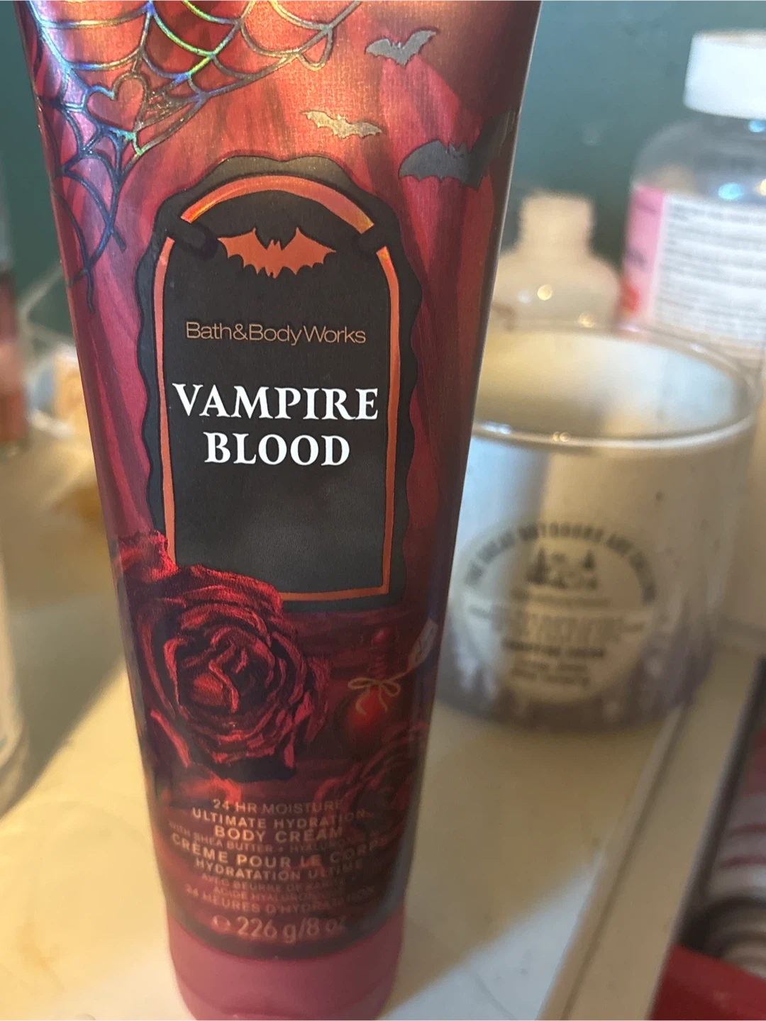 Selling a Bath & Body Works Vampire Blood 24-hour moisture ultimate hydration body cream. It contains shea butter and hyaluronic acid. The cream comes in a 226 g / 8 oz tube. Perfect for spooky season!