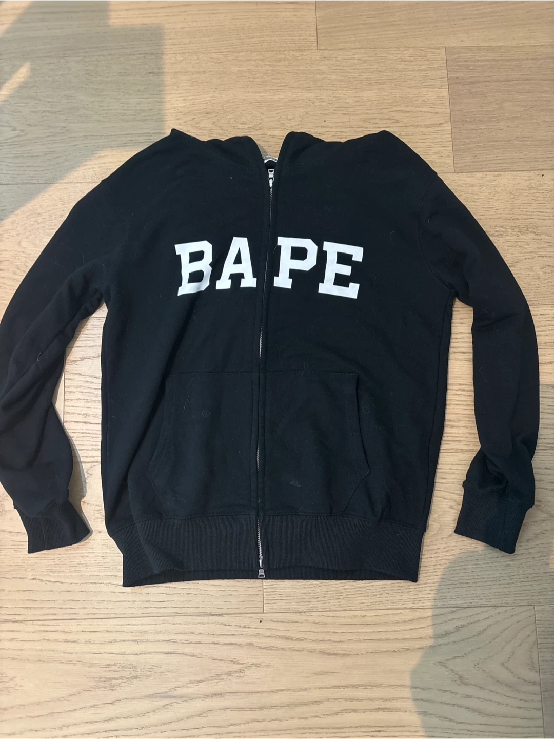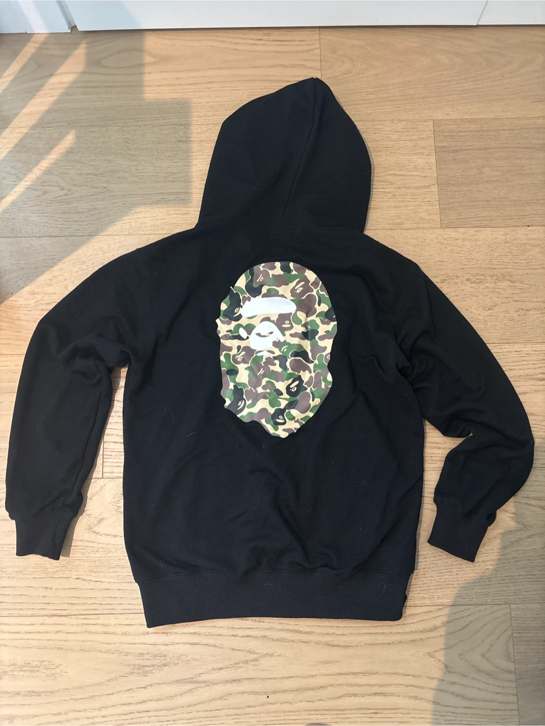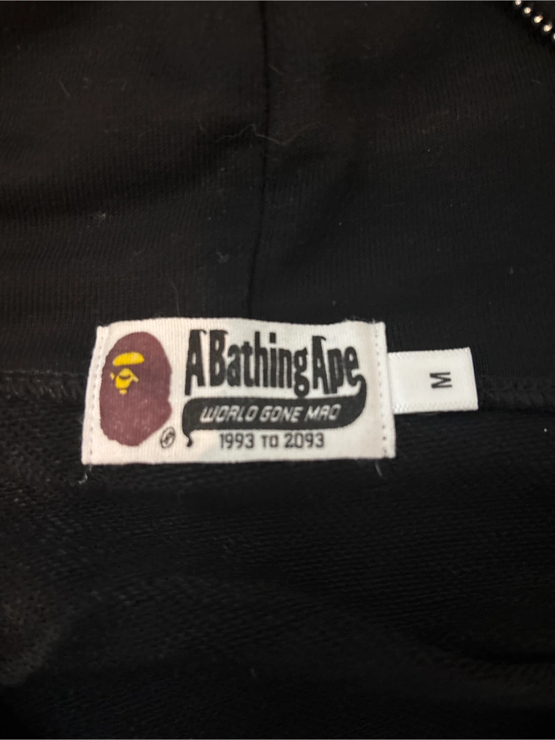Selling a BAPE zip-up hoodie in black. It's a size medium and features the classic BAPE logo on the front and the ape head camo design on the back. The tag says "A Bathing Ape World Gone Mad 1993 to 2093".