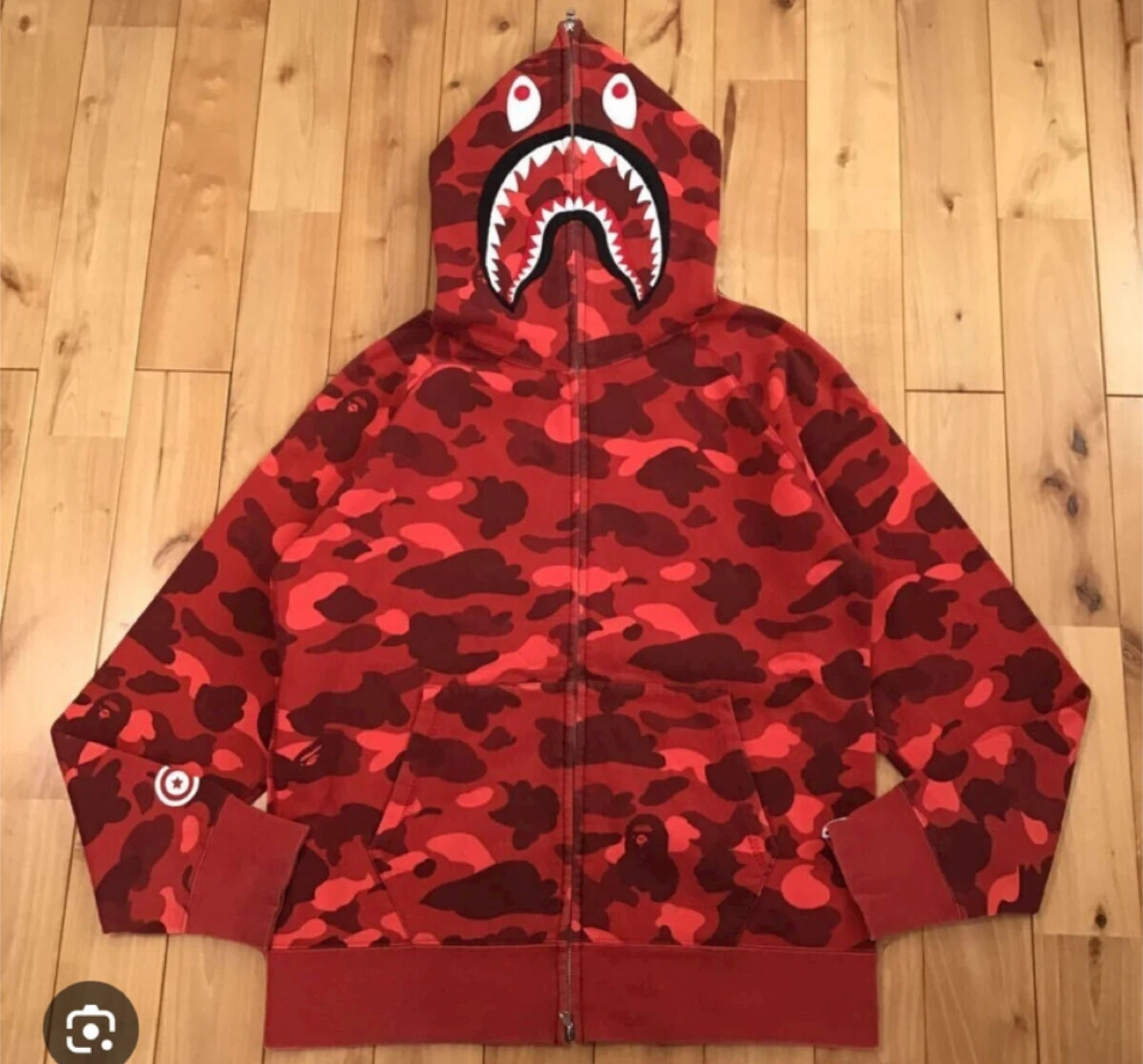 Selling a Bathing Ape (BAPE) full zip hoodie with the iconic shark design. It features a red camouflage pattern. Great for streetwear enthusiasts!