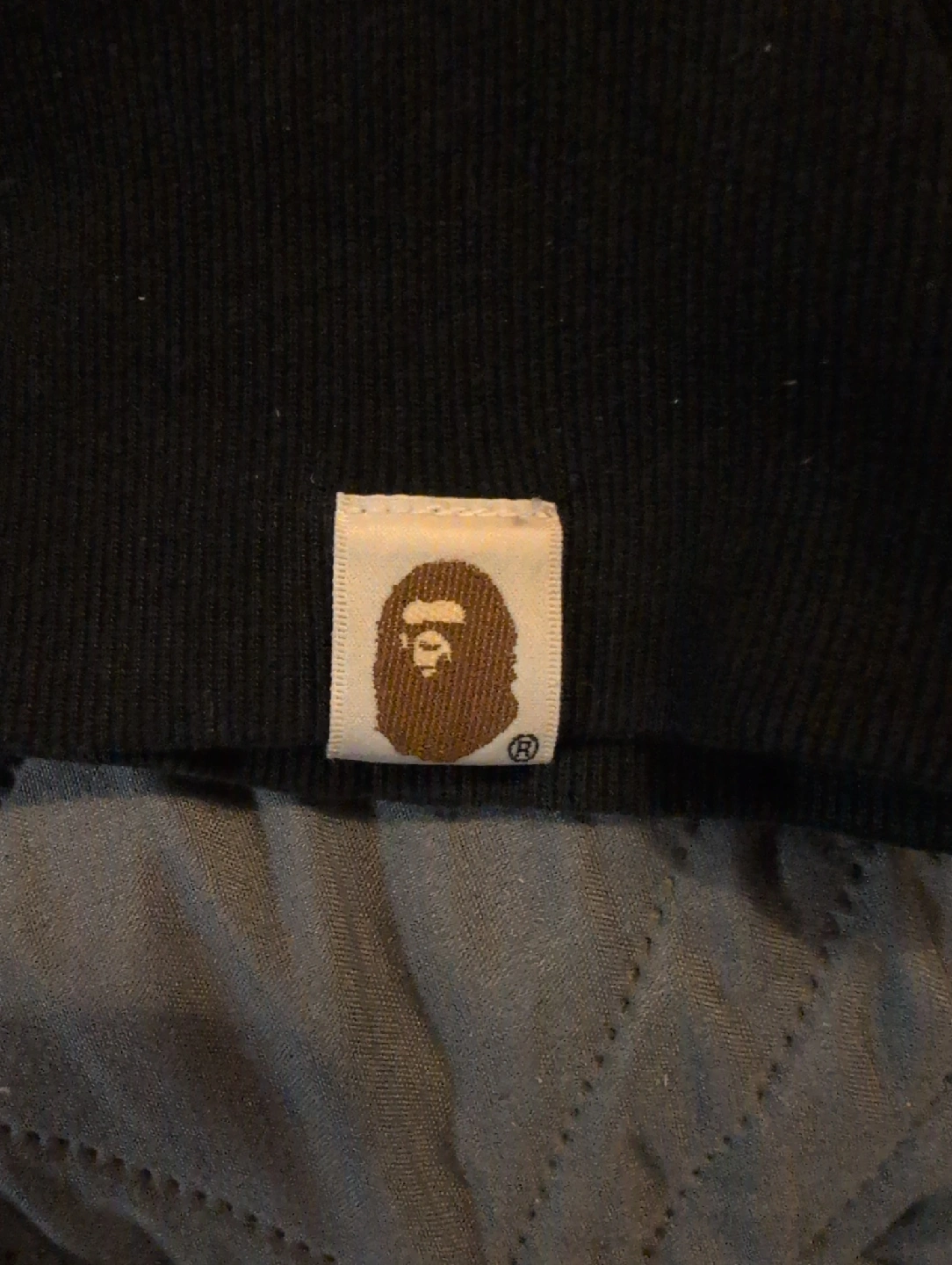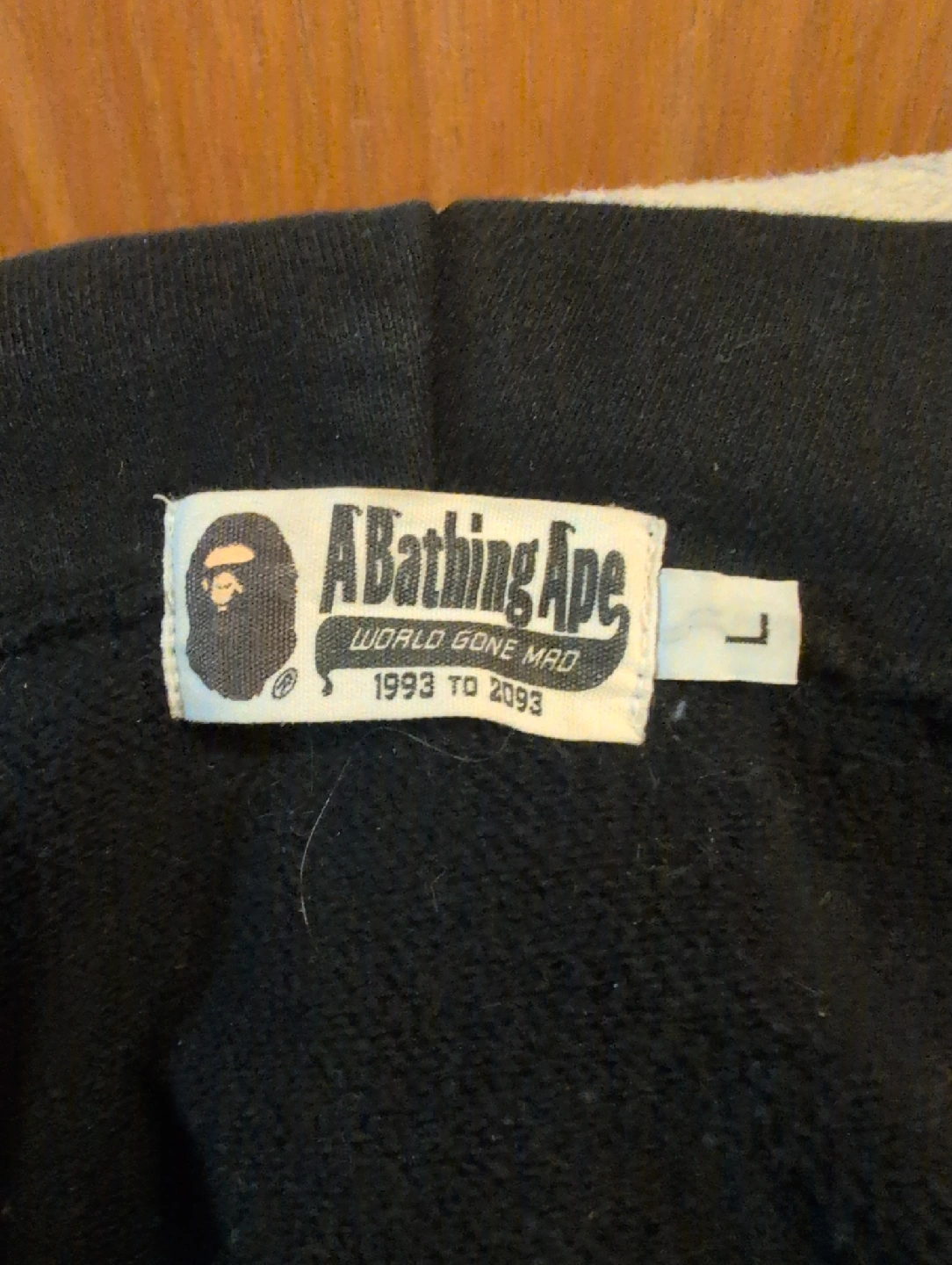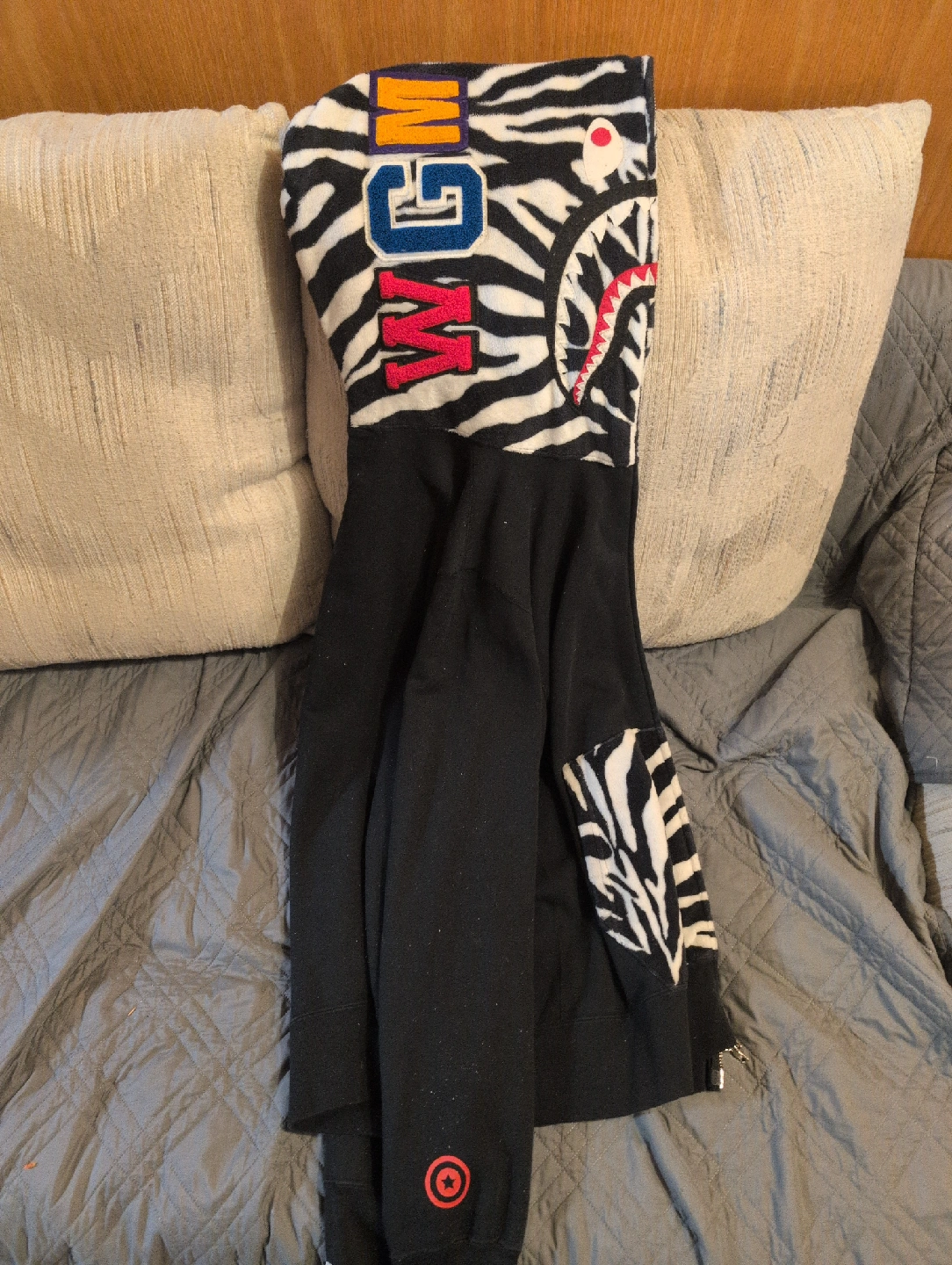 Selling a Bathing Ape (BAPE) shark hoodie in size L. It's black with a zebra print on the hood. The iconic shark design is featured on the hood. A unique piece for any streetwear enthusiast!