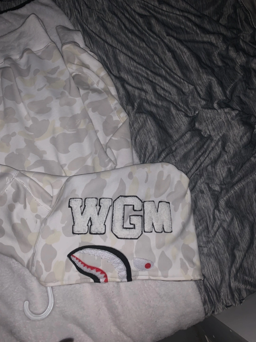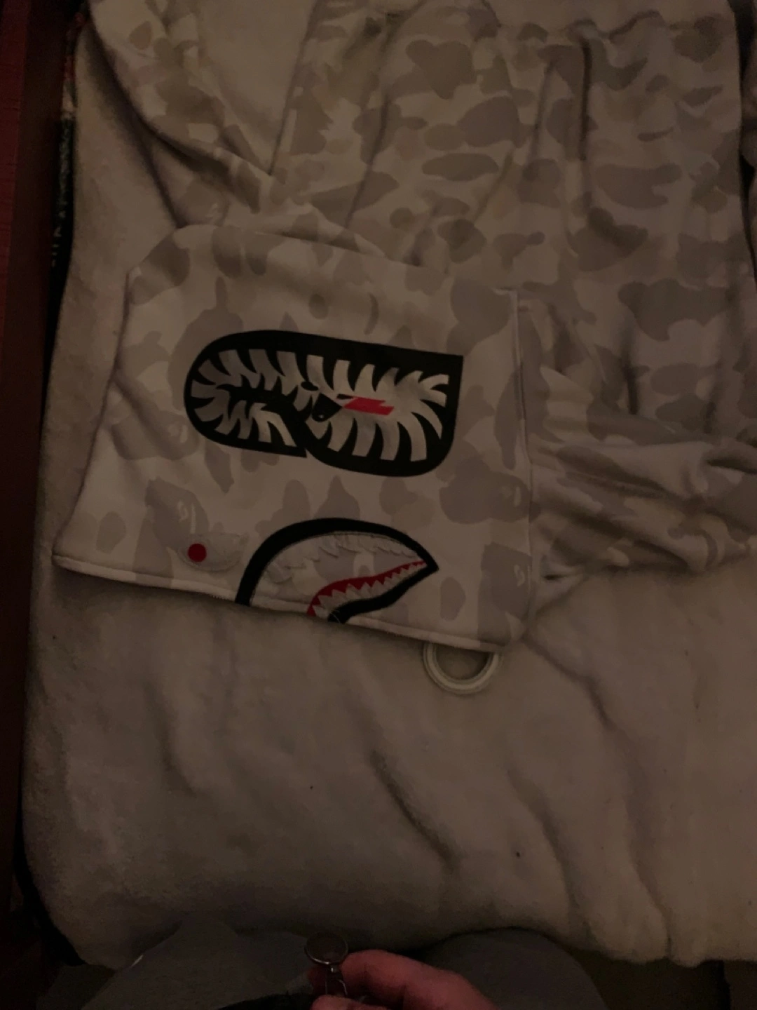 Selling a Bathing Ape (BAPE) White camo shark hoodie in size L. It features the iconic shark design and a cool camo pattern. It's in great condition and is authentic.