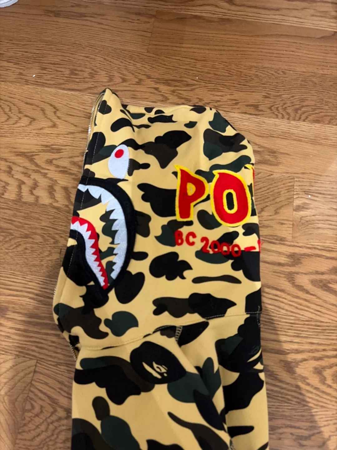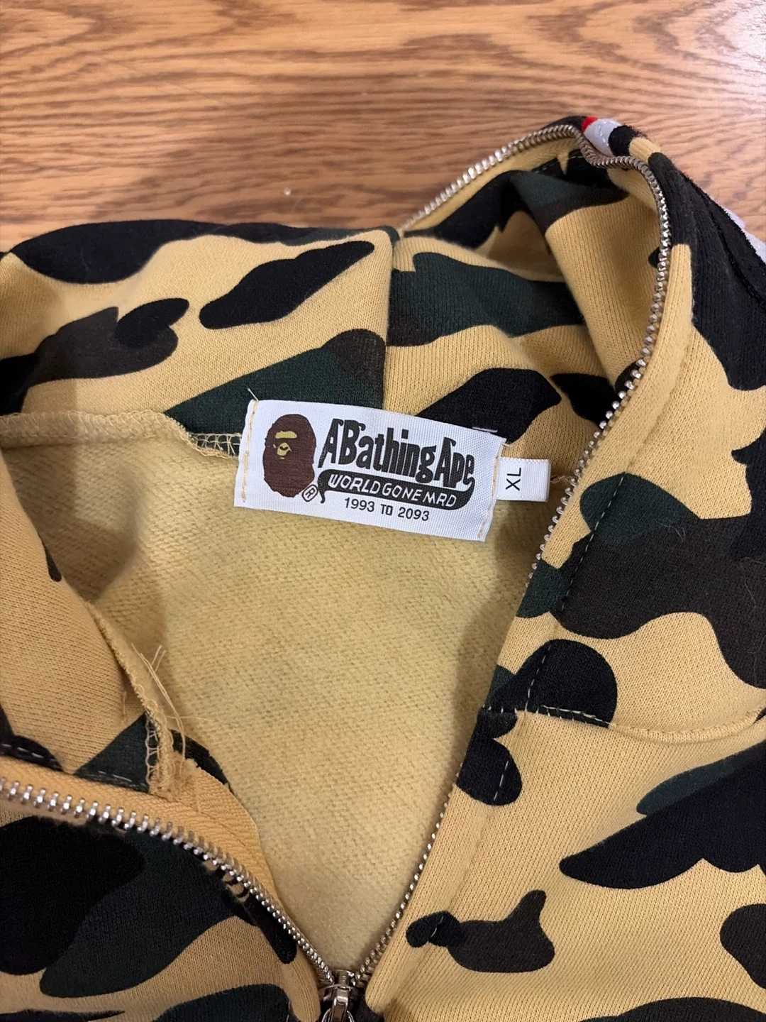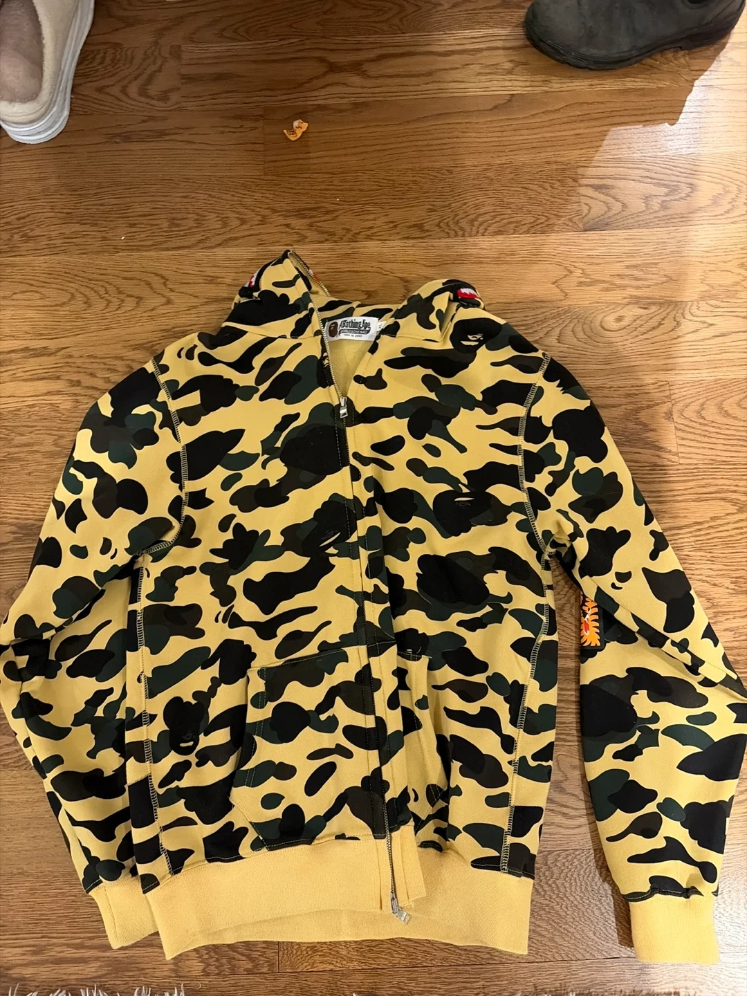 Selling a Bathing Ape (BAPE) full zip hoodie in size XL. It features a yellow camo pattern with the iconic shark design on the hood. The hoodie is in good condition and ready for a new home!