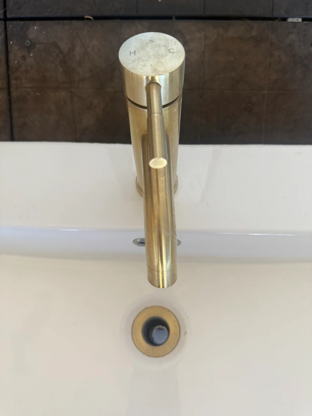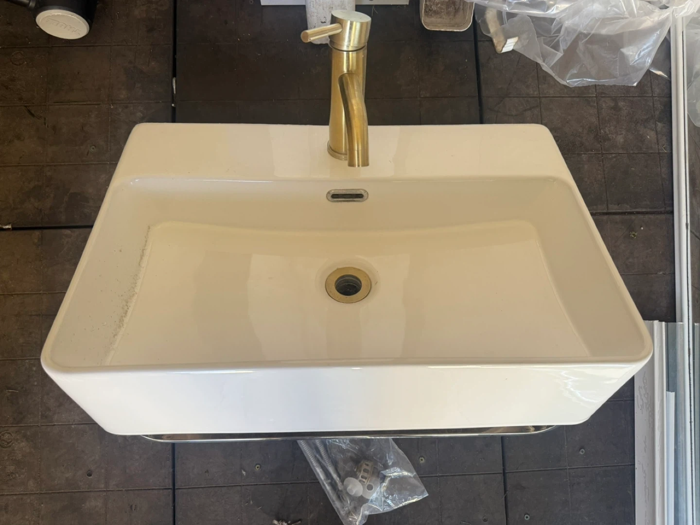Selling a bathroom sink with a stylish gold faucet. It's in great condition and ready to be installed in your bathroom. The sink is a clean white colour, and the gold faucet adds a touch of elegance. Perfect for a bathroom upgrade!