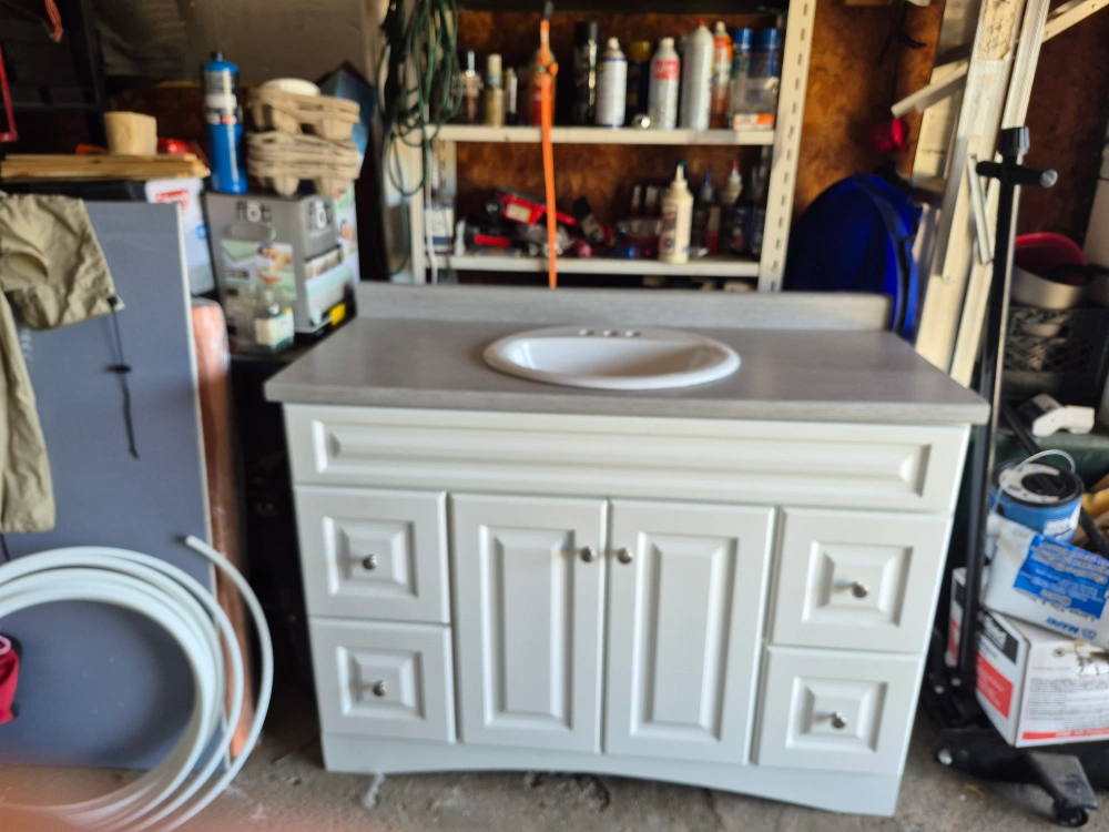 Show allSelling a bathroom vanity with a sink. It features a white cabinet with a grey countertop. Great for a bathroom renovation or upgrade!