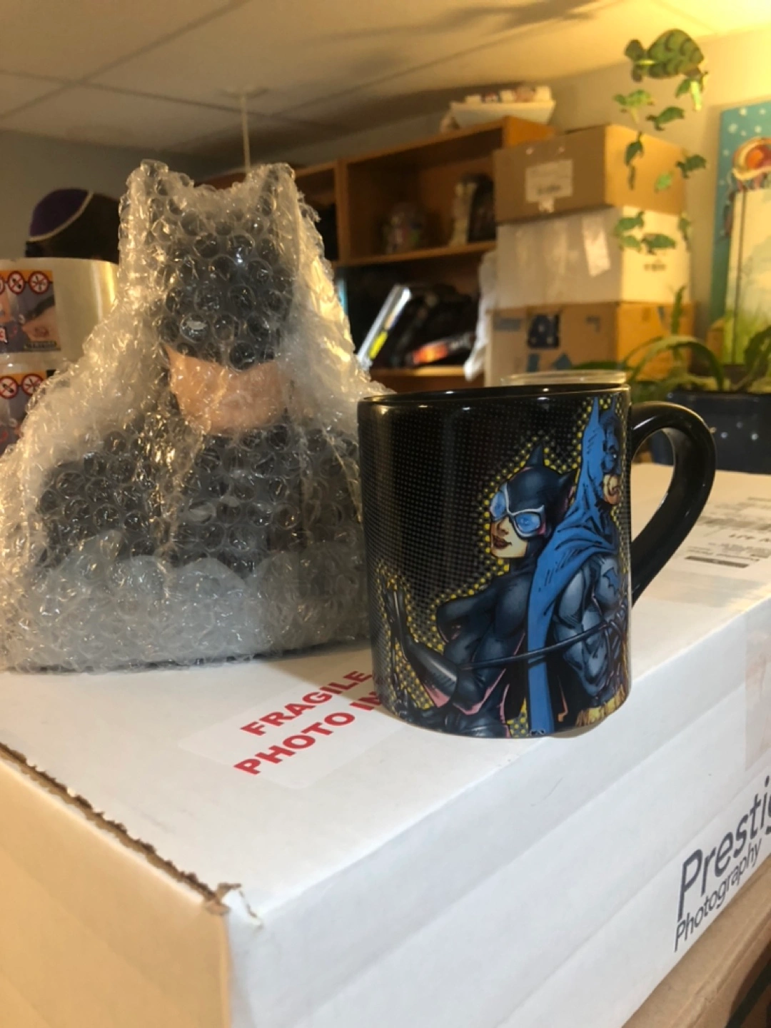 Collectible mug featuring Batman and Catwoman. Includes a bubble-wrapped Batman piggybank. Great for fans of DC Comics.