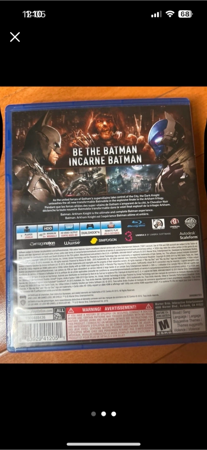 Selling my copy of Batman: Arkham Knight for the PlayStation 4! The disc and case are in excellent shape and ready for a new player to experience the game. Mature 17+
