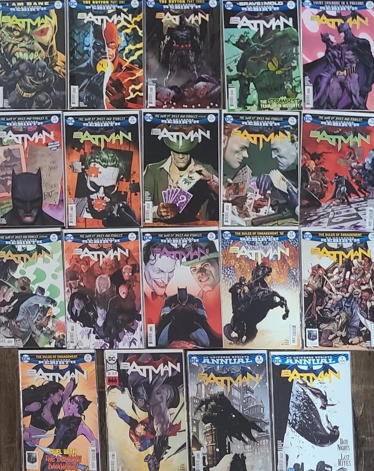 Selling a run of Batman comics (Volume 3) - issues #1-#36 plus Annuals #1 & #2, and the Batman 'Rebirth' one-shot. 39 books total, all in bags with boards and in new condition. Pickup is in Langley. I am selling a few other series as well, so check my profile if you are interested.
