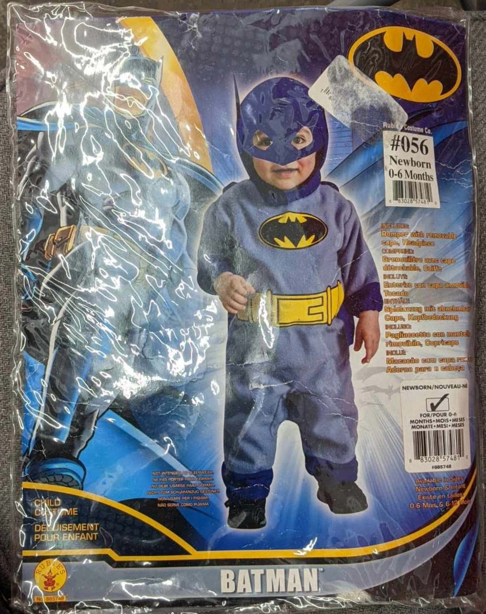 Adorable Batman costume. Newborn size, 0-6 months. Rubie's Costume Co. Includes jumpsuit and removable cape and hood. Perfect for Halloween or themed photoshoot or party. Proceeds to cat rescue, Kit Cat Club Of Hamilton Upper Wentworth and Queensdale area Hamilton mountain