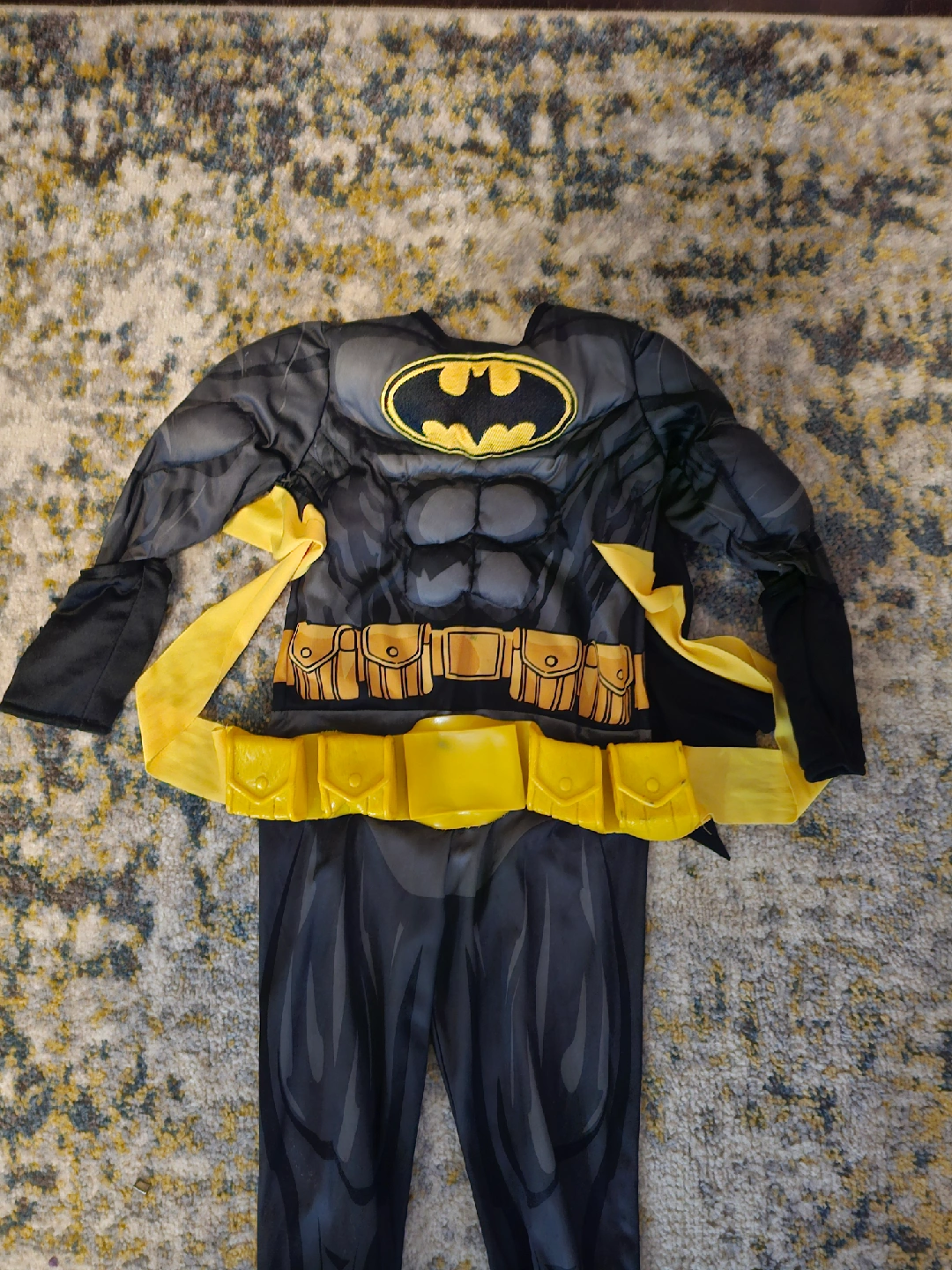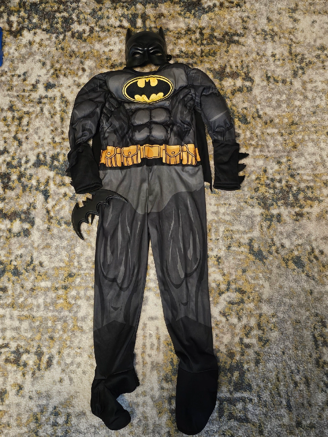 Batman costume with mask, cape and batarang. Great for Halloween or dress up! kids size 5-6