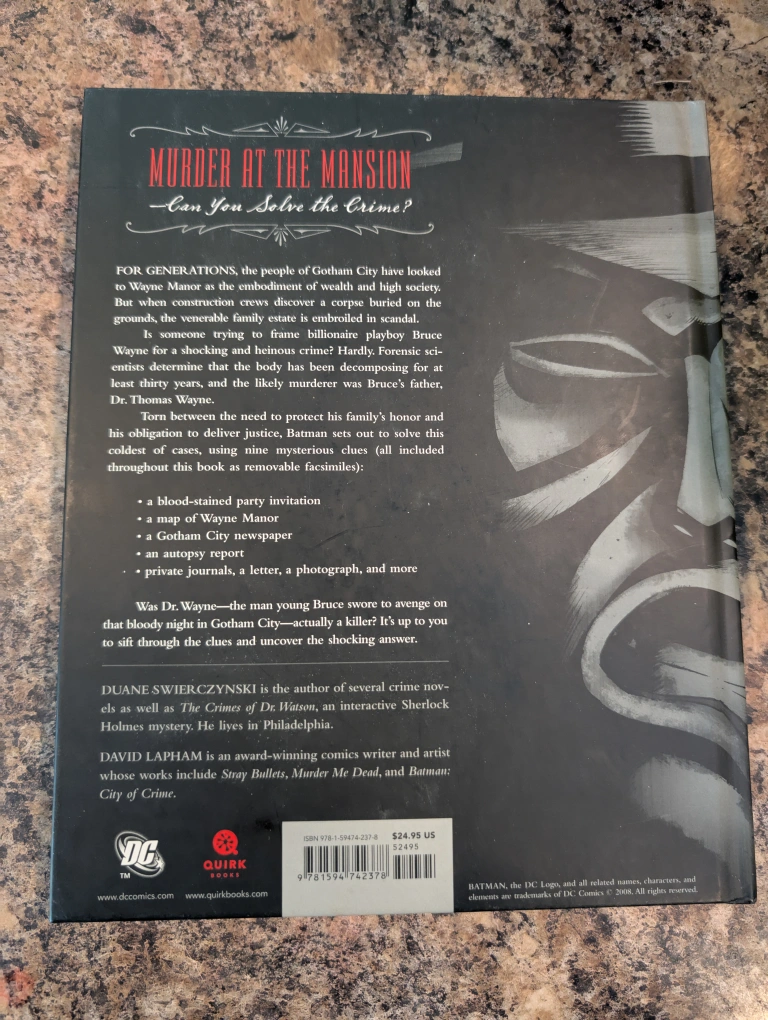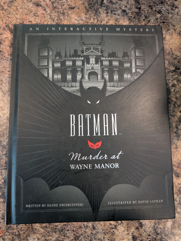 Selling an interactive mystery book, Batman: Murder at Wayne Manor. Written by Duane Swierczynski and illustrated by David Lapham, this book offers a unique and engaging experience for Batman fans. Can you solve the crime at the mansion?