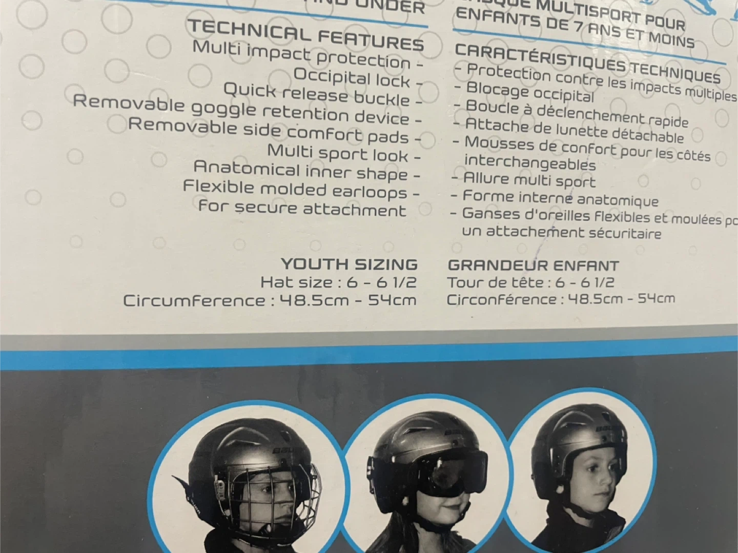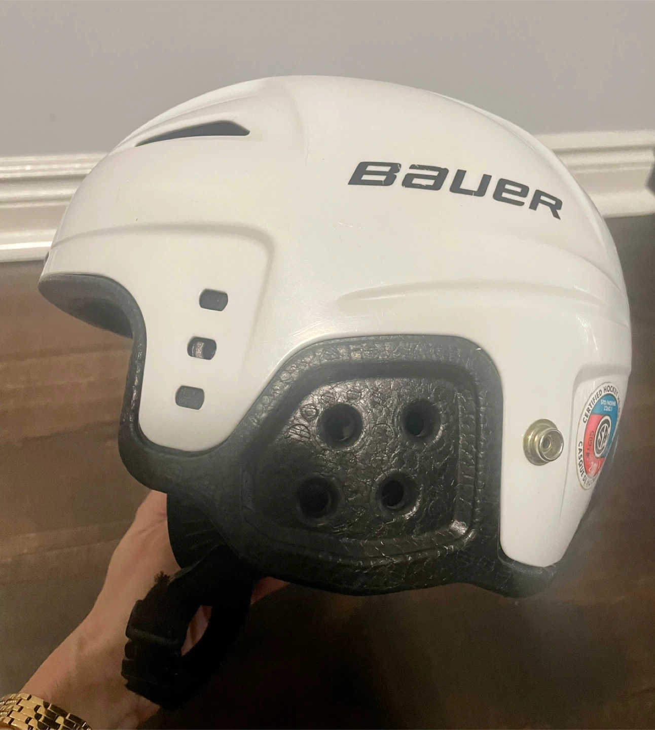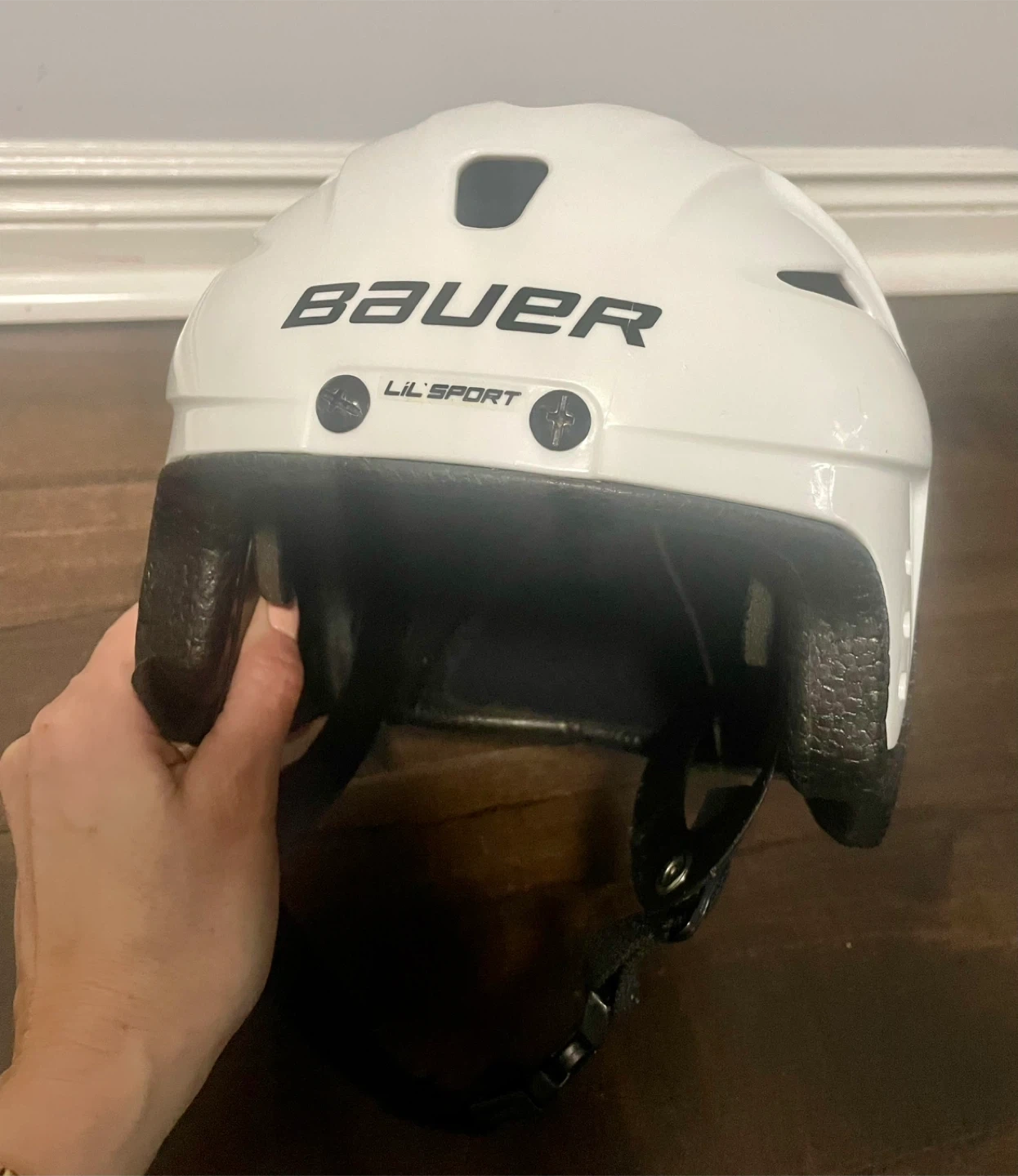 Giving a Bauer Lil' Sport hockey helmet. It's white and in great shape for protecting your little one on the ice. No cage