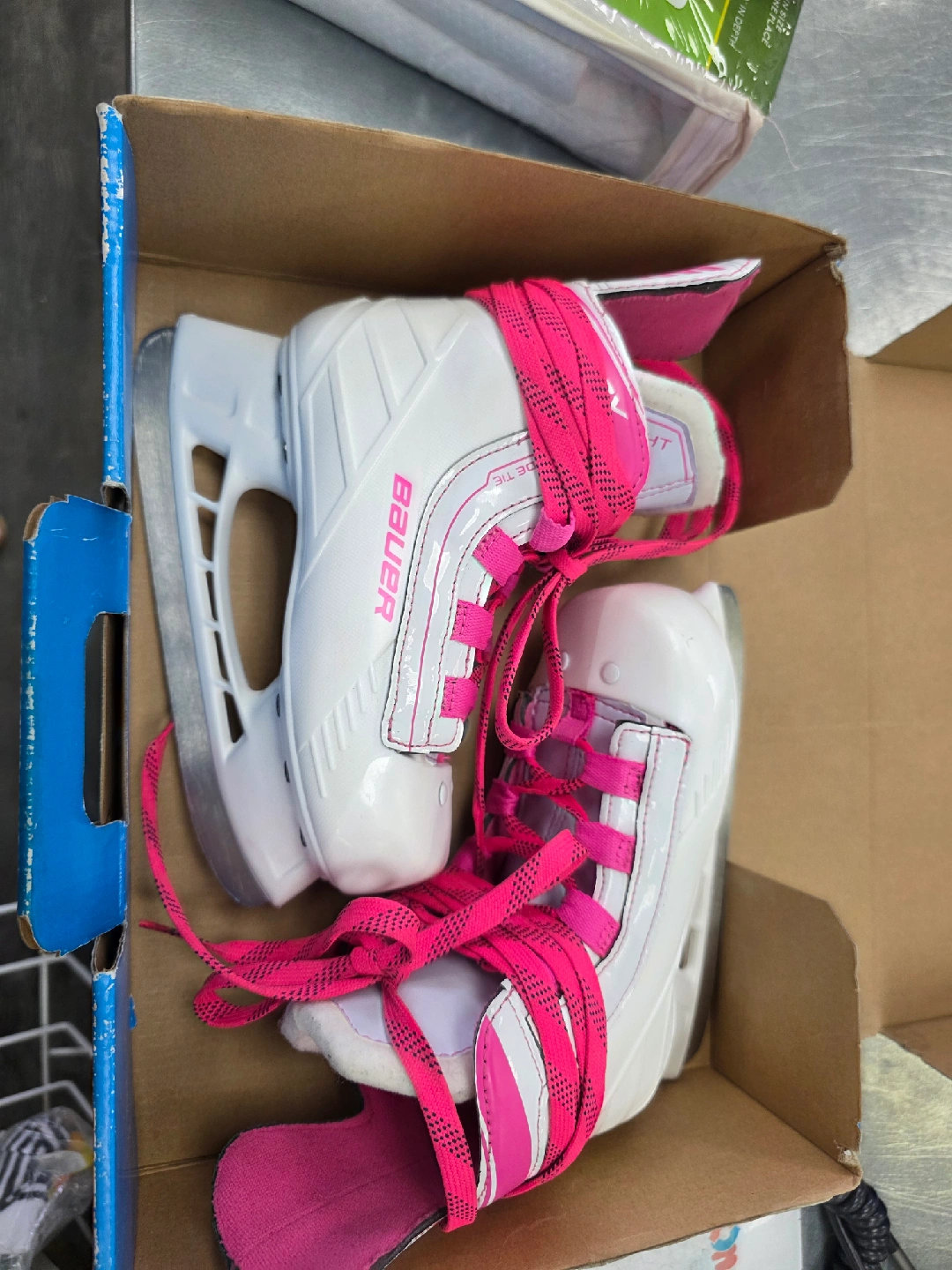 Selling a pair of Bauer ice skates in white and pink! They come in the original box and are ready for some fun on the ice Size Youth 10 - 11 comes with Extra long laces My child outgrew them and hardly worn them