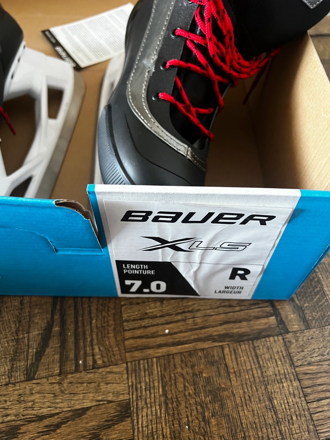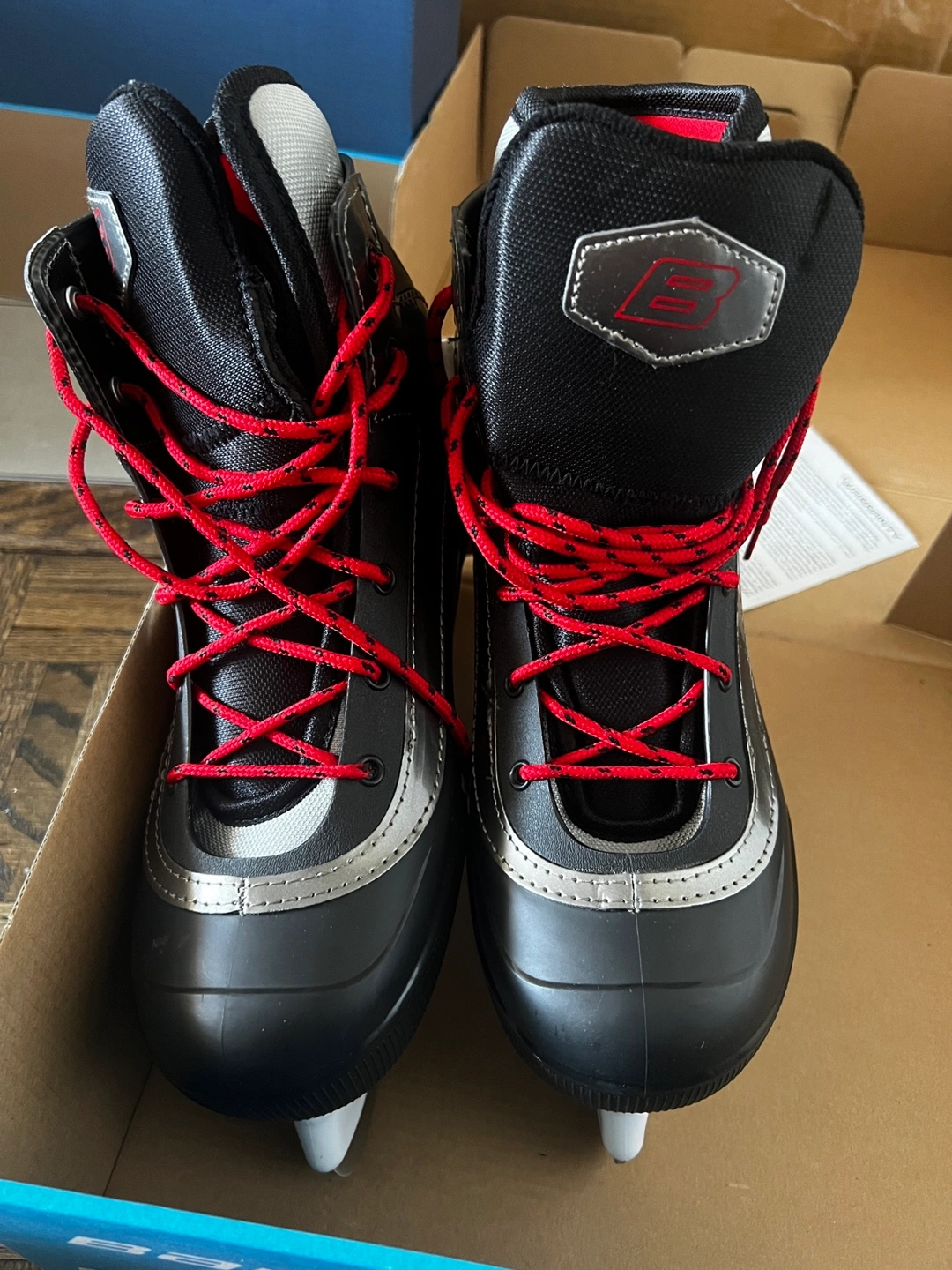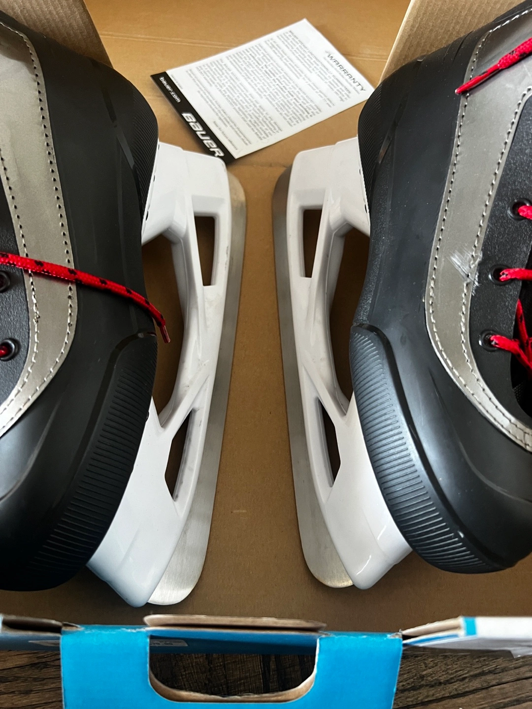 Selling is a pair of Bauer ice hockey skates. These skates have been used once — still in the original box and bought in 120 Cad. Ideal for recreational or beginner-level skaters. Features: • Sleek black and silver design with durable red laces • Comfortable ankle padding for added support • Pre-sharpened stainless steel blades • Perfect for ice rinks or outdoor use • Bauer quality – trusted by hockey players everywhere