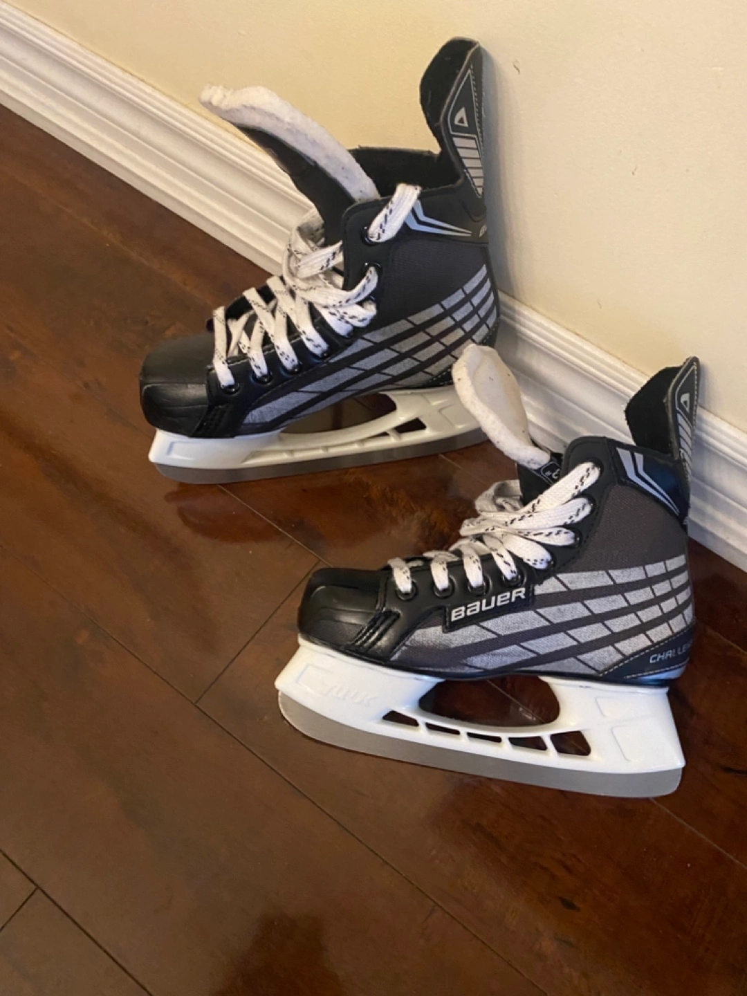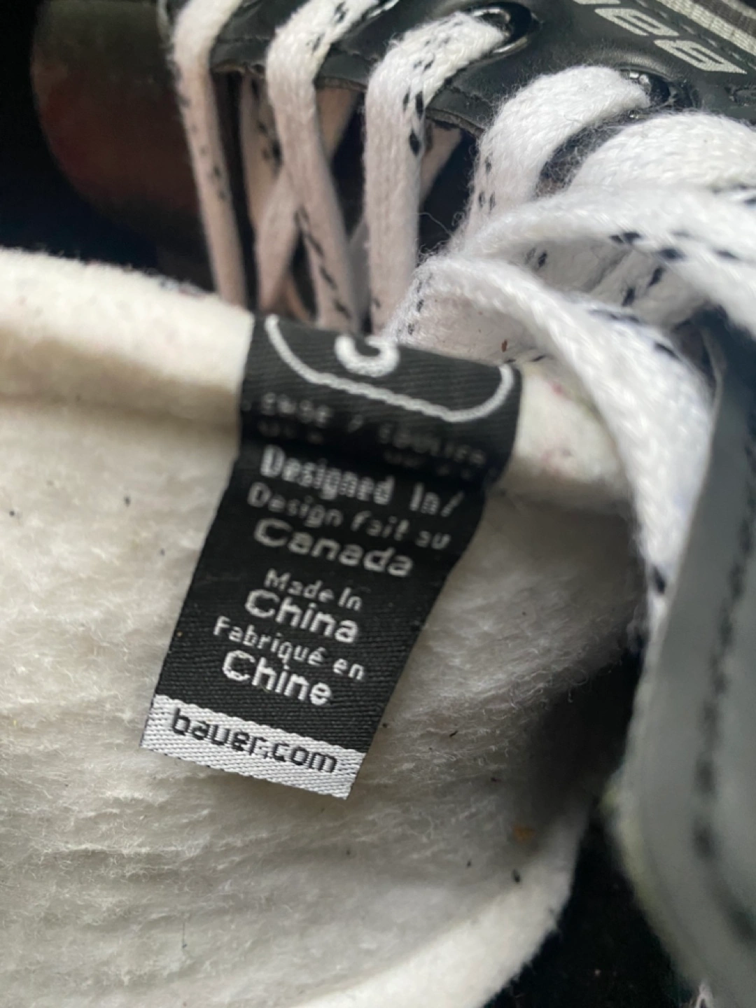 Used youth Bauer ice skates. Black and grey design. Lace-up closure. Designed in Canada, made in China.