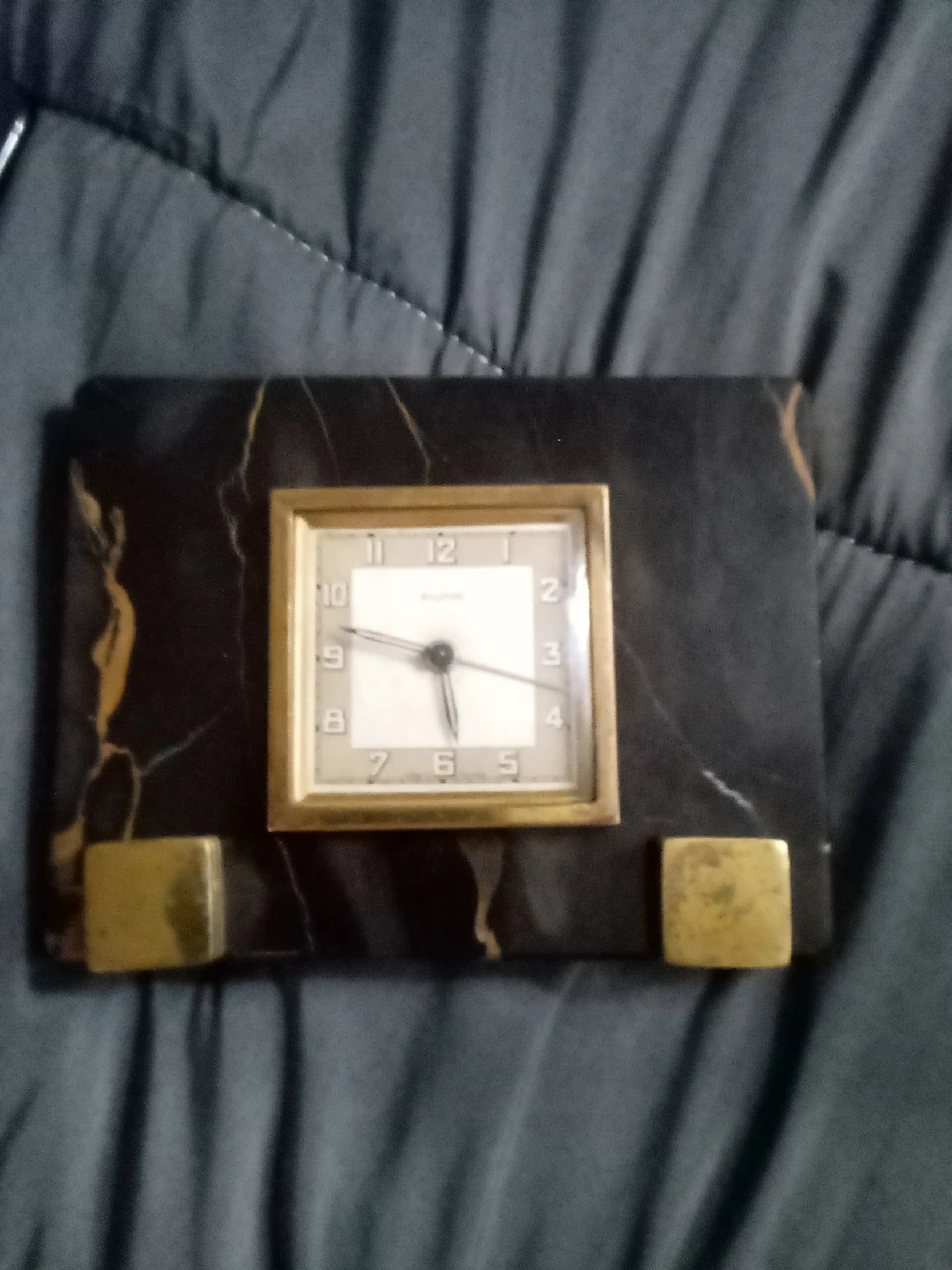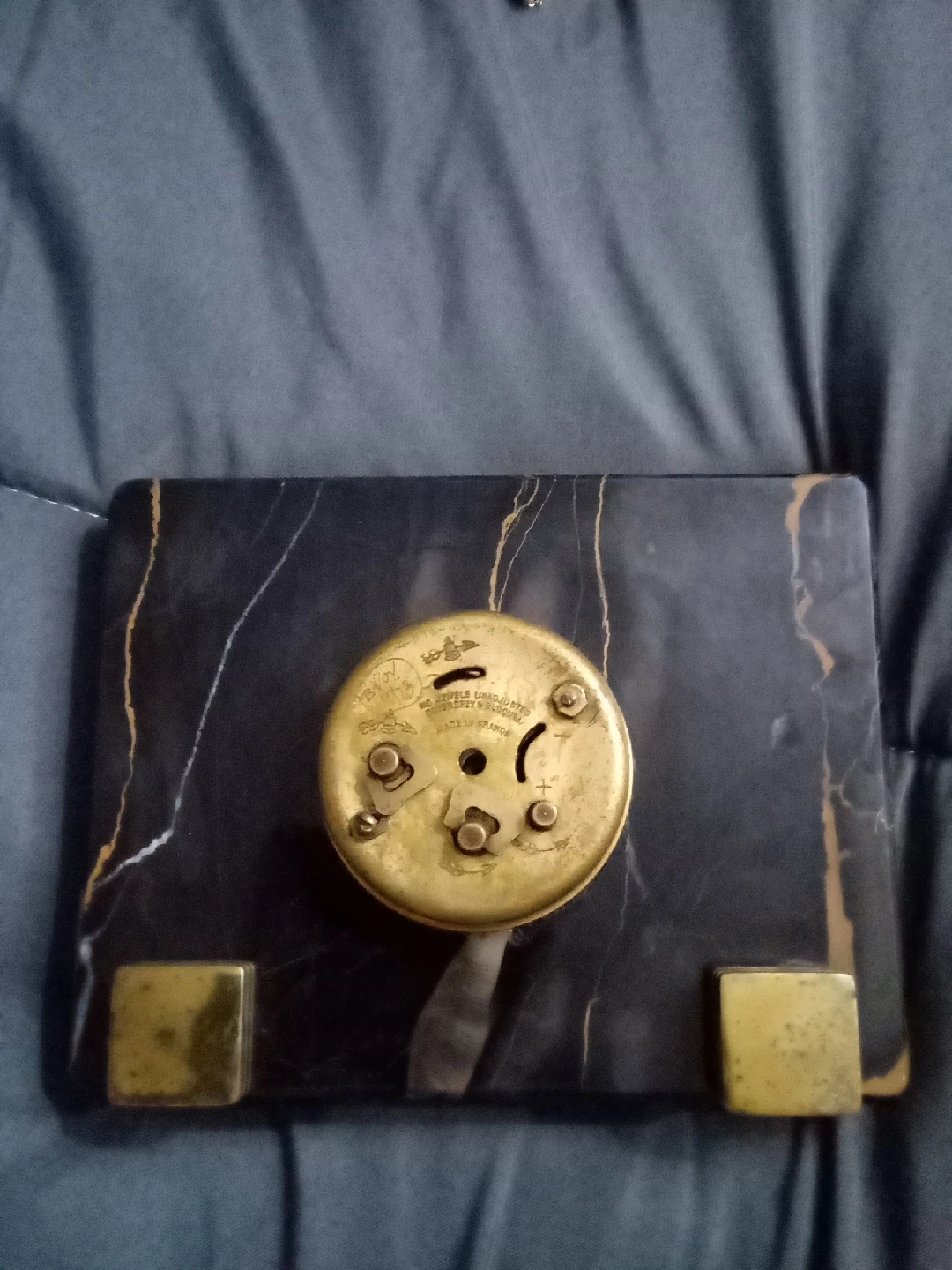 this is a very antique French marble mantle clock and it is very very unique and very rare therefore very desirable for anybody who's a collector of early Victorian French timepieces. not only is it beautiful but it is a real treasure to have.Selling a tabletop clock. It's a quartz clock with a black and gold marble design. It has gold accents on the corners. The clock face is white with black numbers and hands.