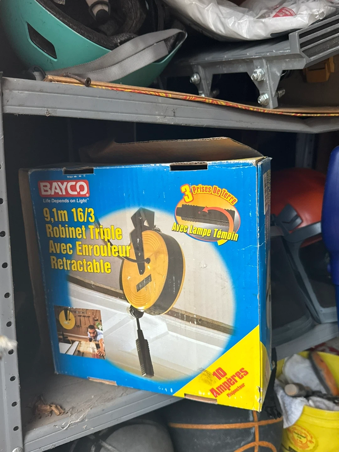 Selling a BAYCO retractable triple outlet reel with a 9.1m 16/3 cord. It comes with an indicator light and is rated for 10 Amperes. Perfect for your workshop or garage!