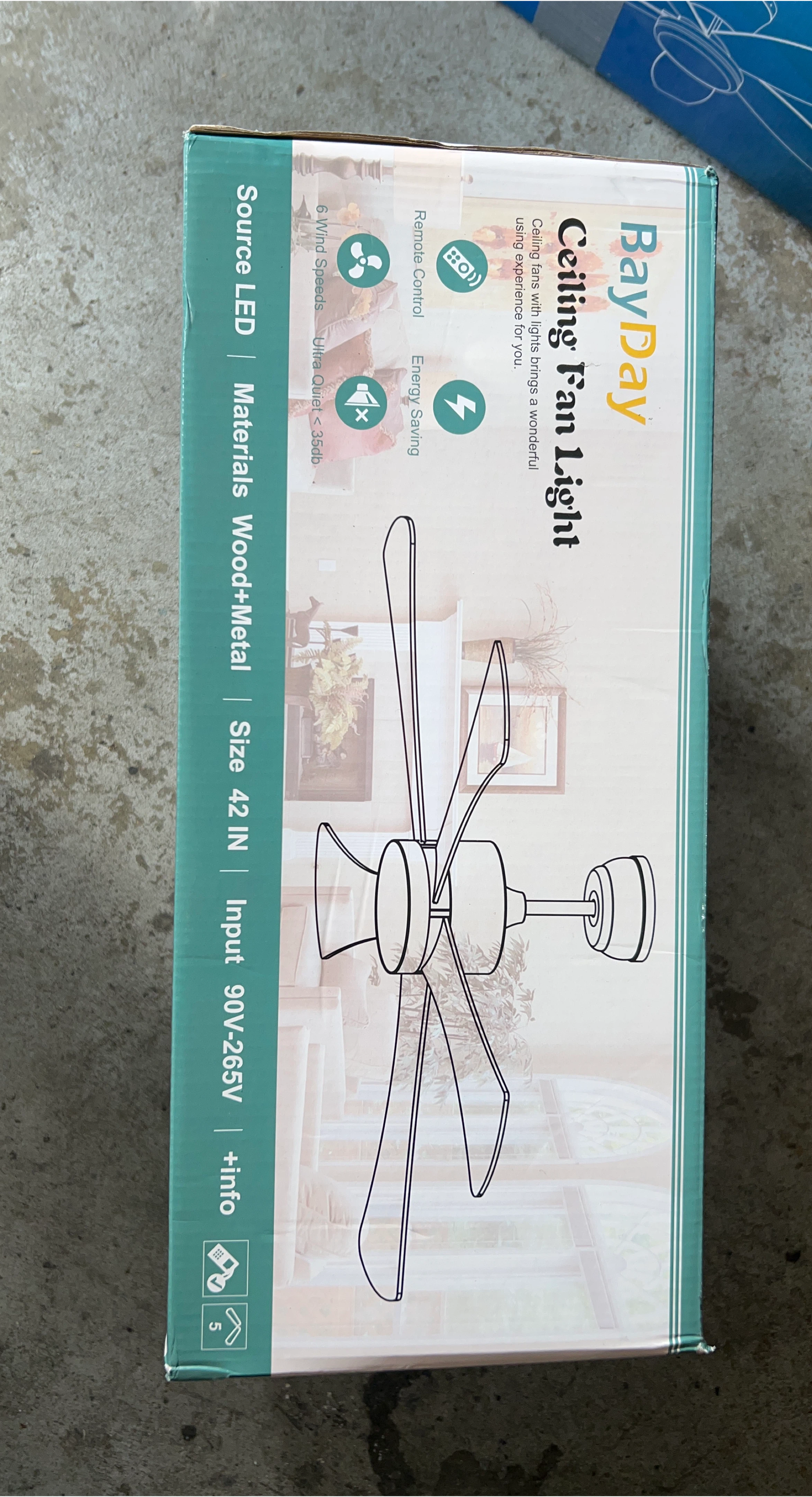 Selling a brand new BayDay ceiling fan with a light! It's still in the box and ready to bring a wonderful experience to your home. It has 6 wind speeds and operates ultra-quietly at less than 35db. The fan is 42 inches in size and made with wood and metal materials. It also features a remote control and energy-saving design