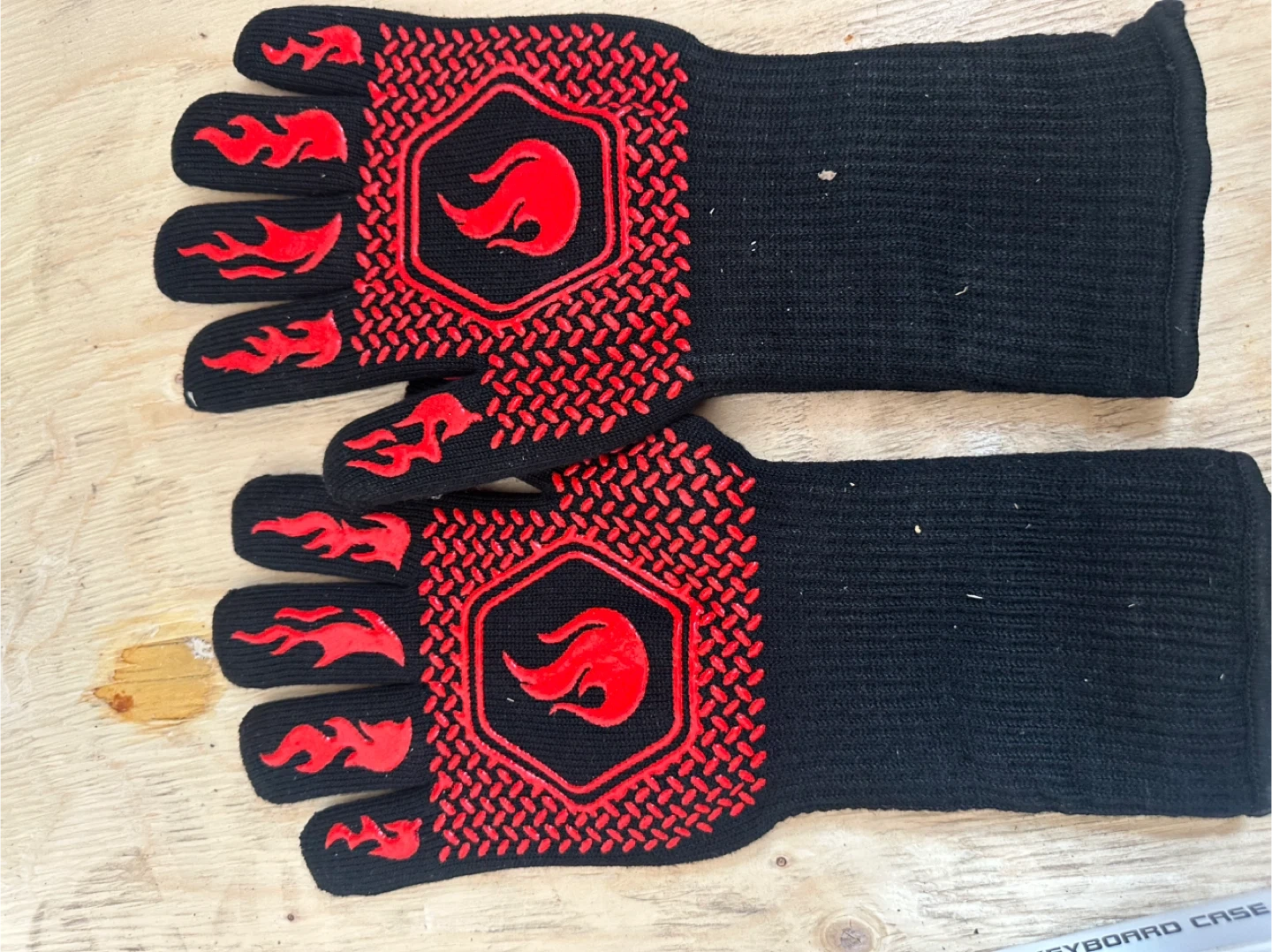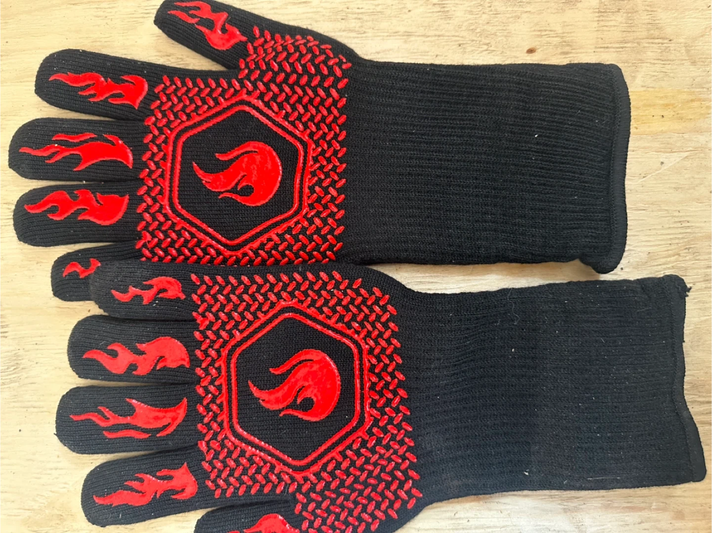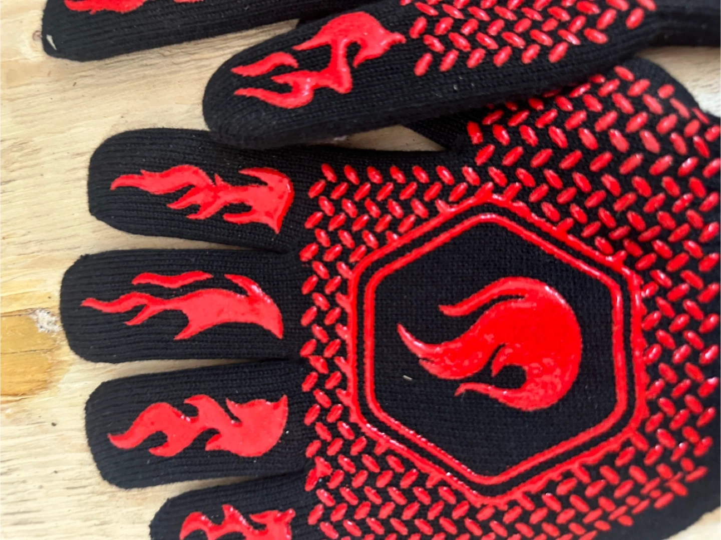 These black BBQ gloves with red flame detailing are perfect for grilling or baking! They're heat resistant, so you can handle hot items with ease. Great for any BBQ enthusiast or home cook