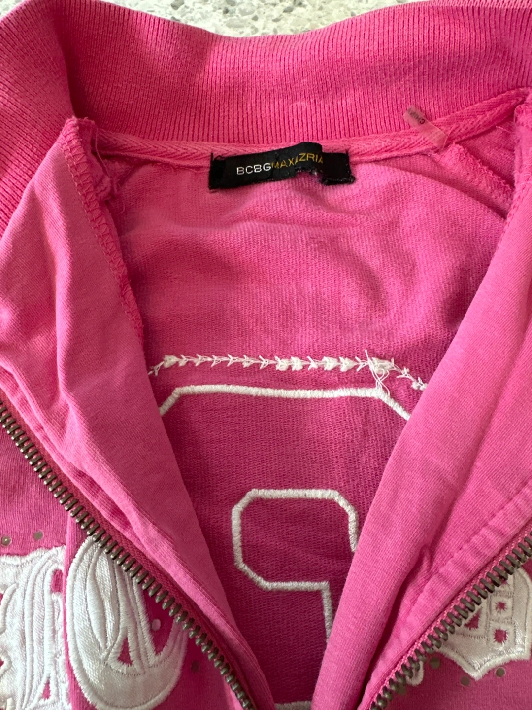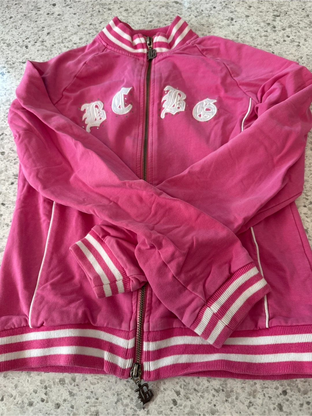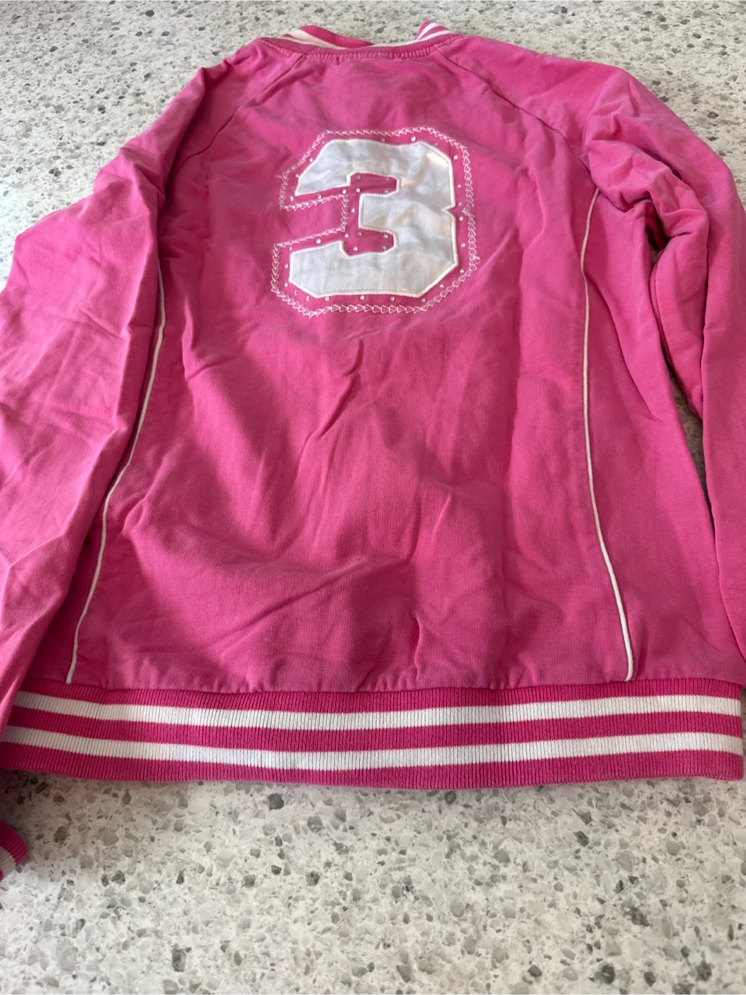 Selling a cute BCBG Max Azria pink jacket! It features a zipper and a sporty design with stripes on the cuffs and hem. It has a number 3 on the back. Great for layering or wearing on its own
