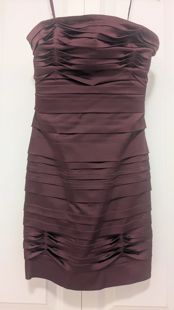 Stunning burgundy strapless mini dress. Features pleated bodice and layered skirt. Perfect for a special occasion.