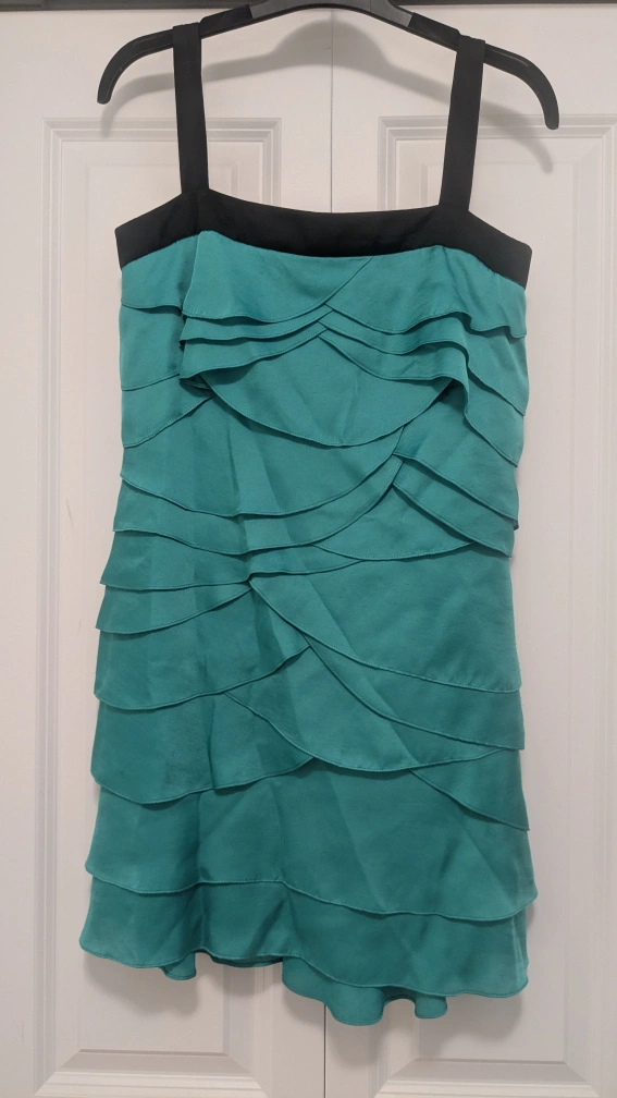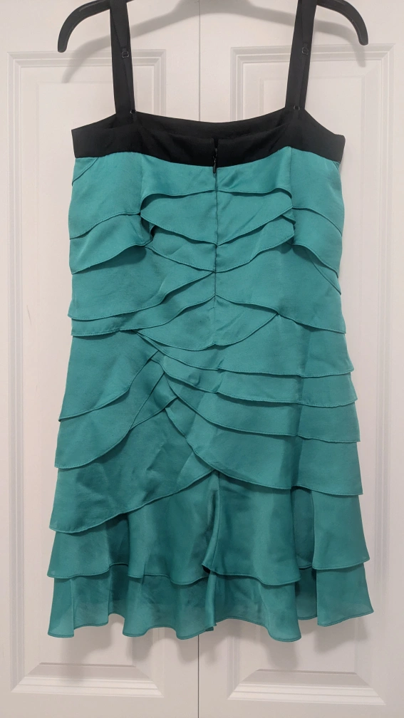 Beautiful emerald green mini cocktail dress. Features ruched layers and black adjustable straps. Back zipper closure. Perfect for a special occasion.