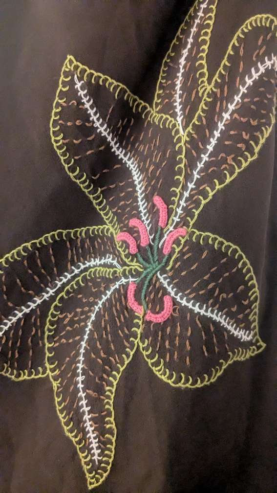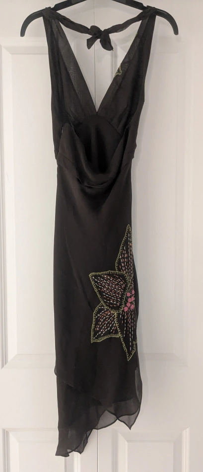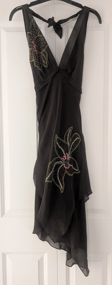 Beautiful chocolate brown silk halter self-tie neck dress. Features asymmetrical hemline and unique embroidered floral accents. Lightweight fabric. Great for day and evening events.