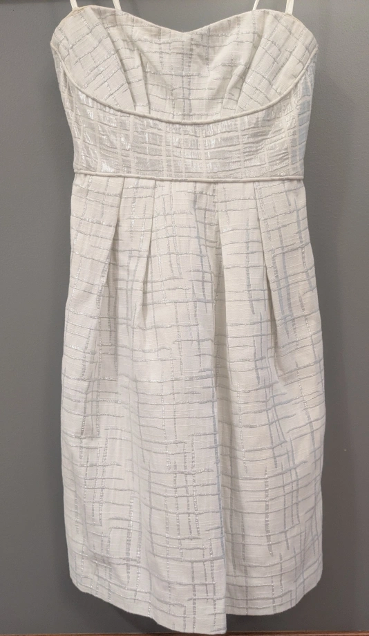 Beautiful white dress. Features a strapless design and a silver geometric pattern. Fully lined. Elegant and stylish. Perfect for a special occasion.