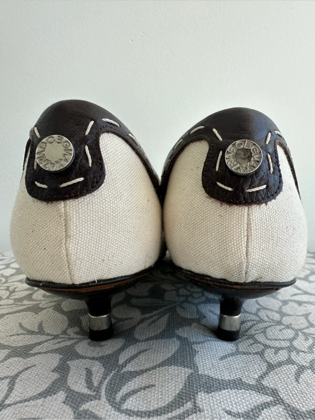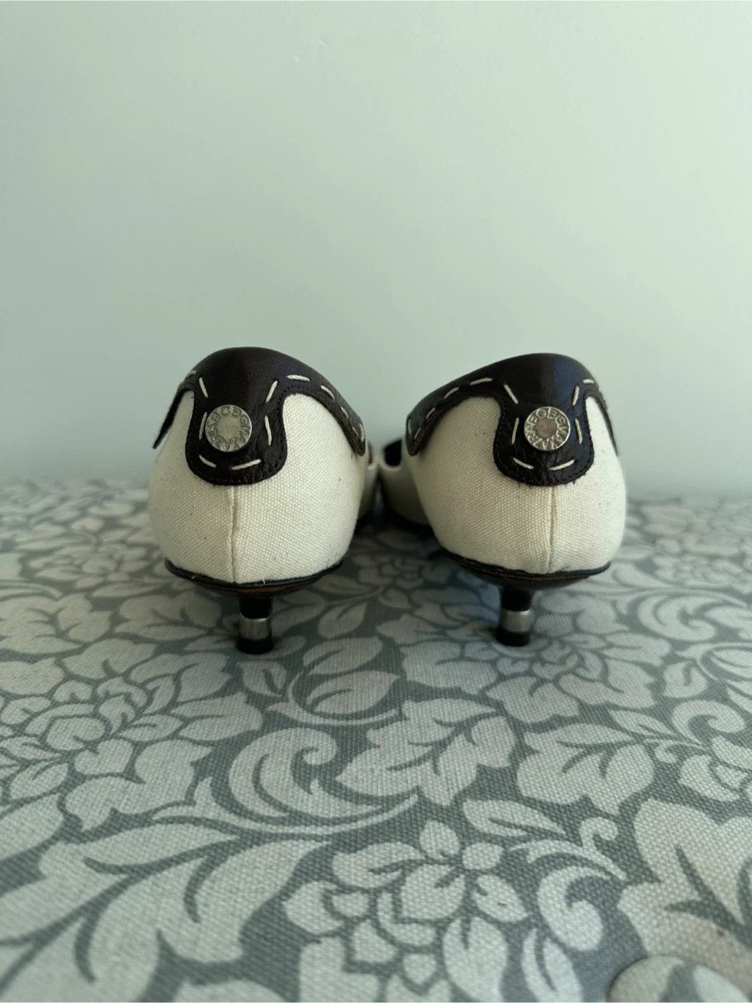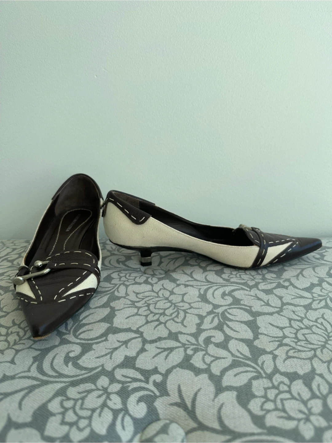 These stylish BCBGMAXAZRIA heels feature a unique design with brown leather and cream canvas accents. They have a pointed toe and a kitten heel, perfect for adding a touch of elegance to any outfit. They are in great condition! Heel: 1.5 inches