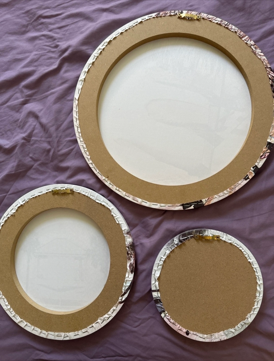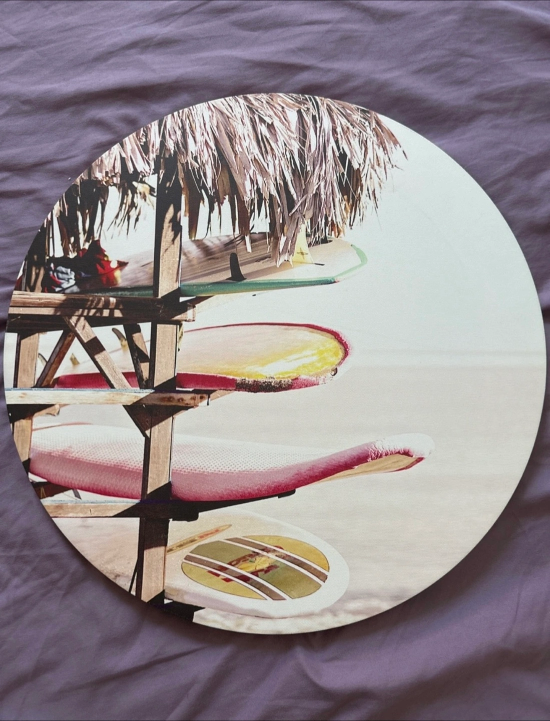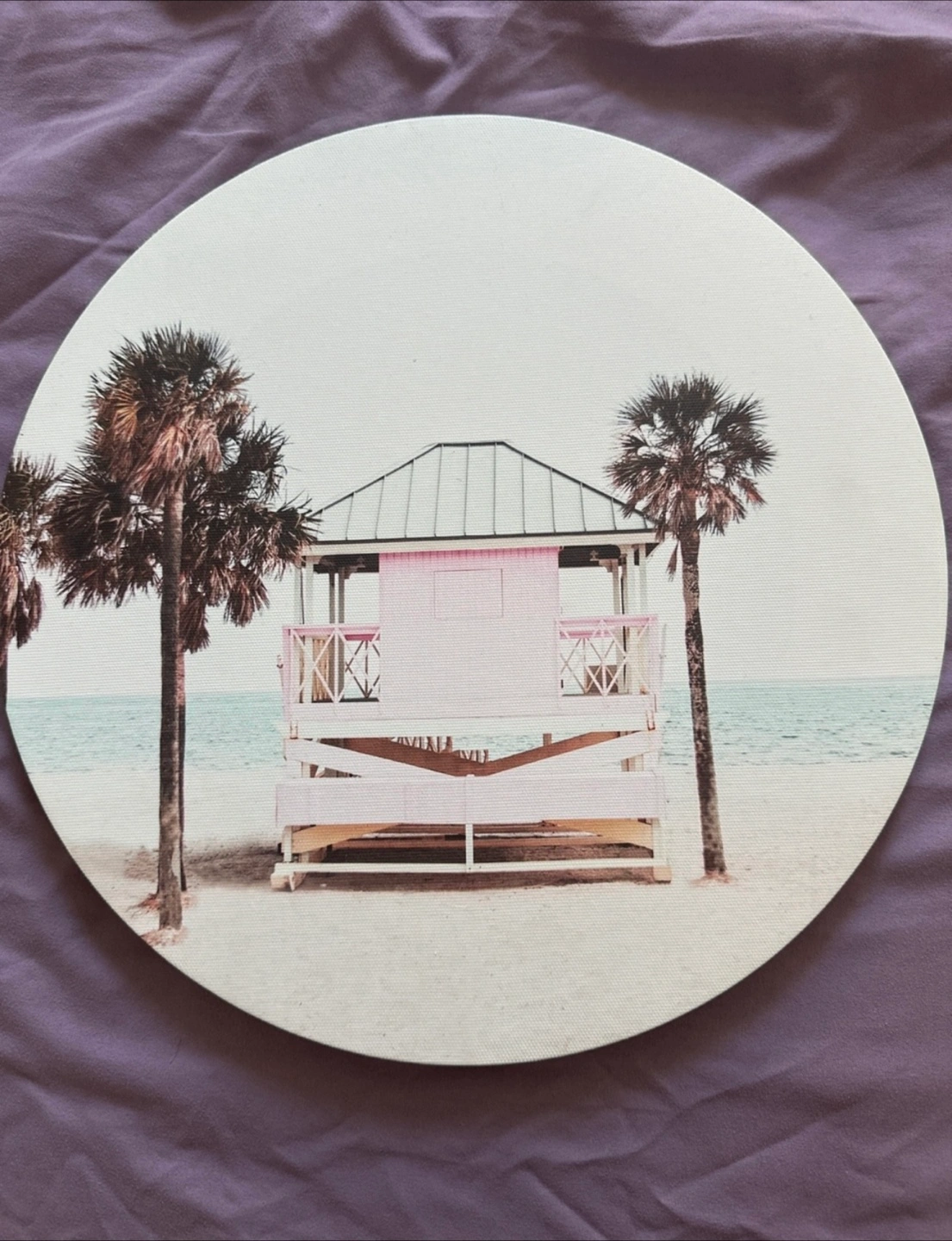 Selling a set of three round canvas wall art pieces. They feature lovely beach scenes with palm trees, surfboards, and a cute pink lifeguard station. Perfect for adding a touch of summer to any room