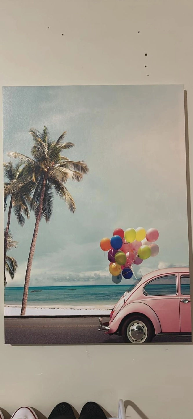 A lovely canvas print featuring a beach scene with palm trees, a pink car, and colourful balloons! It's in great condition and would look great in any room