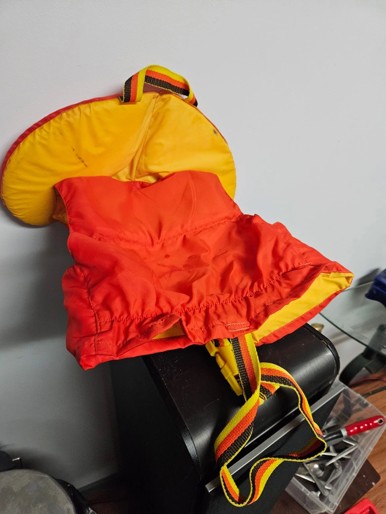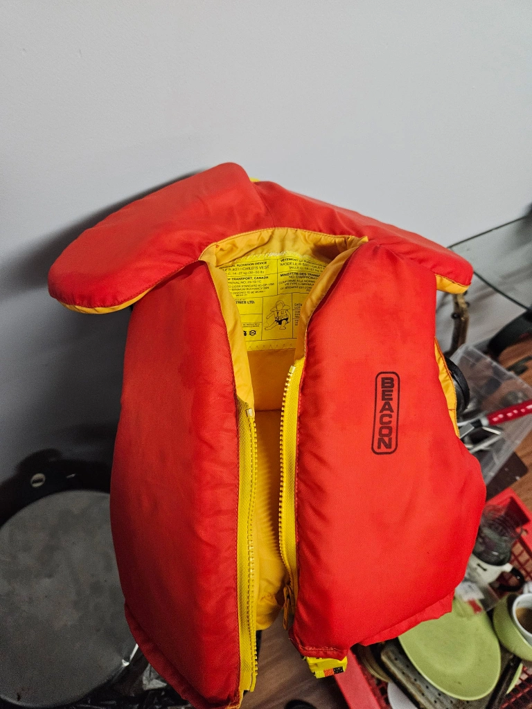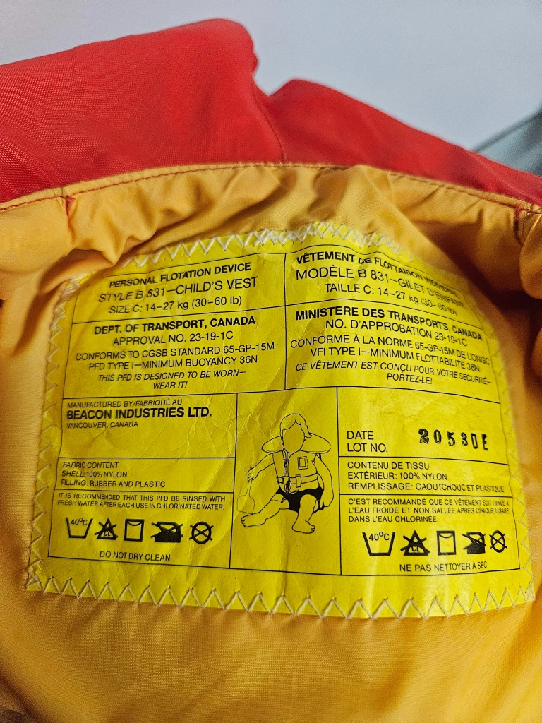 This is a personal flotation device, specifically a child's vest. It's a Beacon Industries Ltd. Style B 831. It fits kids weighing 14-27 kg (30-60 lb). The fabric content is 100% nylon