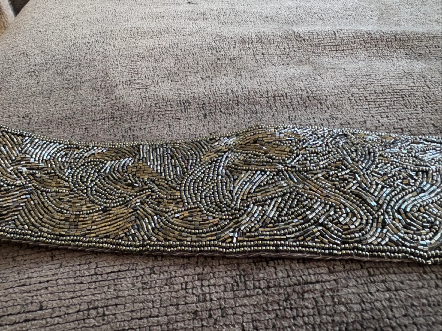 Selling a beaded belt in silver and grey tones. It features a beautiful beaded design on the front and a smooth backing with a velcro closure. Great for adding a touch of elegance to any outfit!