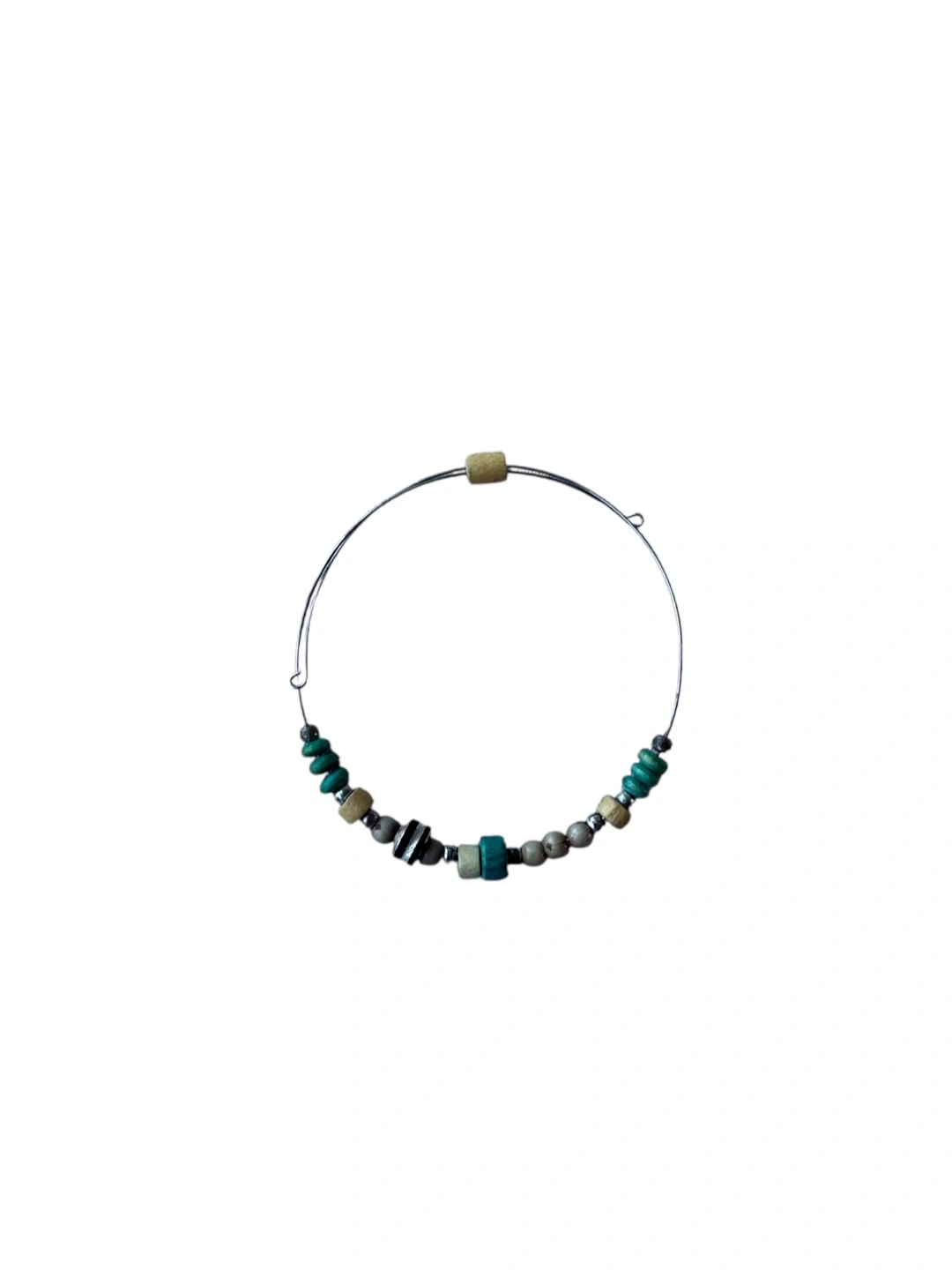 This is a cute beaded bracelet! It features a mix of turquoise, wood, and silver-tone beads strung on a thin wire. It's perfect for adding a pop of colour to any outfit