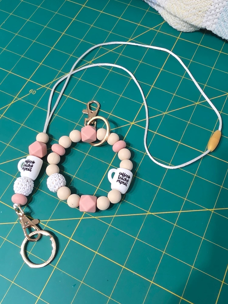 This is a cute beaded lanyard and bracelet set! The beads are in neutral and blush tones, with a fun 'Coffee Teach Repeat' mug accent bead. Perfect for teachers!