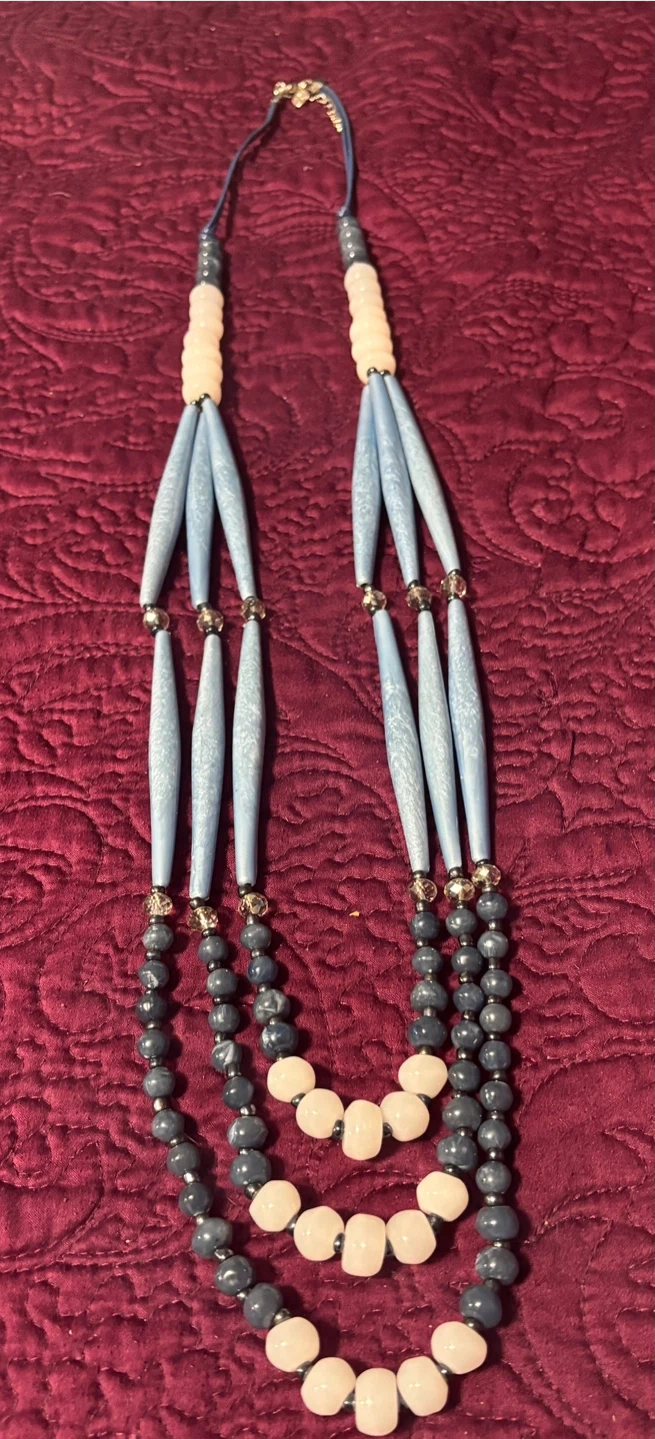 This is a beautiful beaded necklace with a unique design! It features strands of blue, grey, and white beads. It's in great condition and would make a lovely addition to any outfit