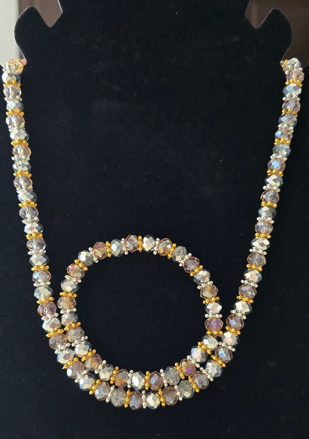 Beautiful beaded necklace and bracelet set. The beads are a mix of clear, gold, and iridescent colours. Perfect for adding a touch of sparkle to any outfit!