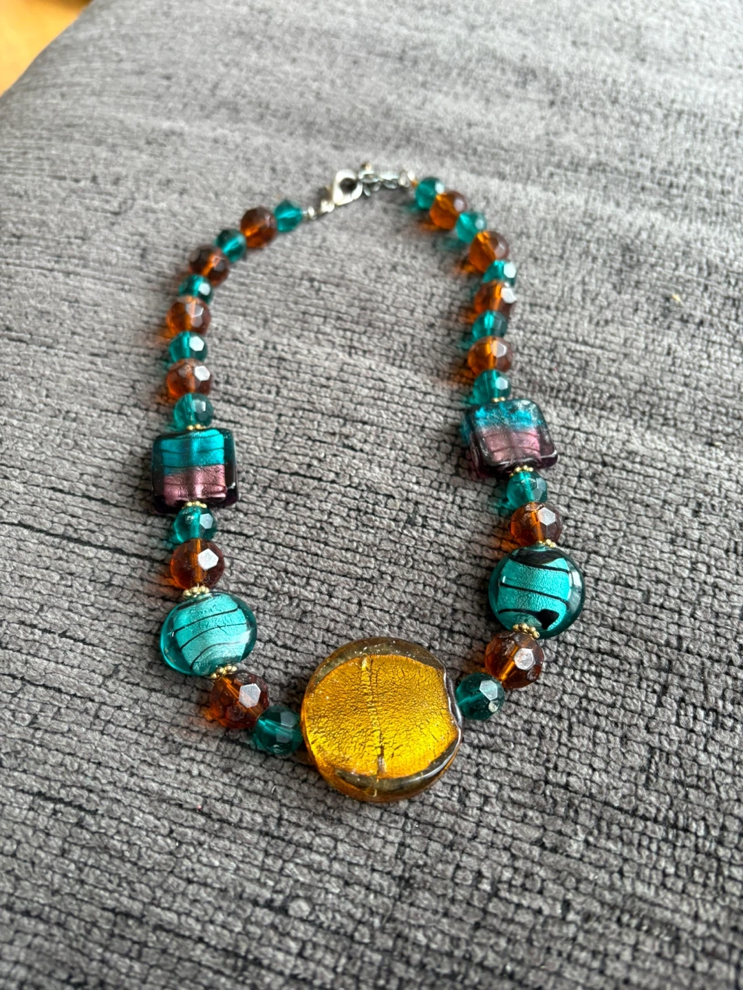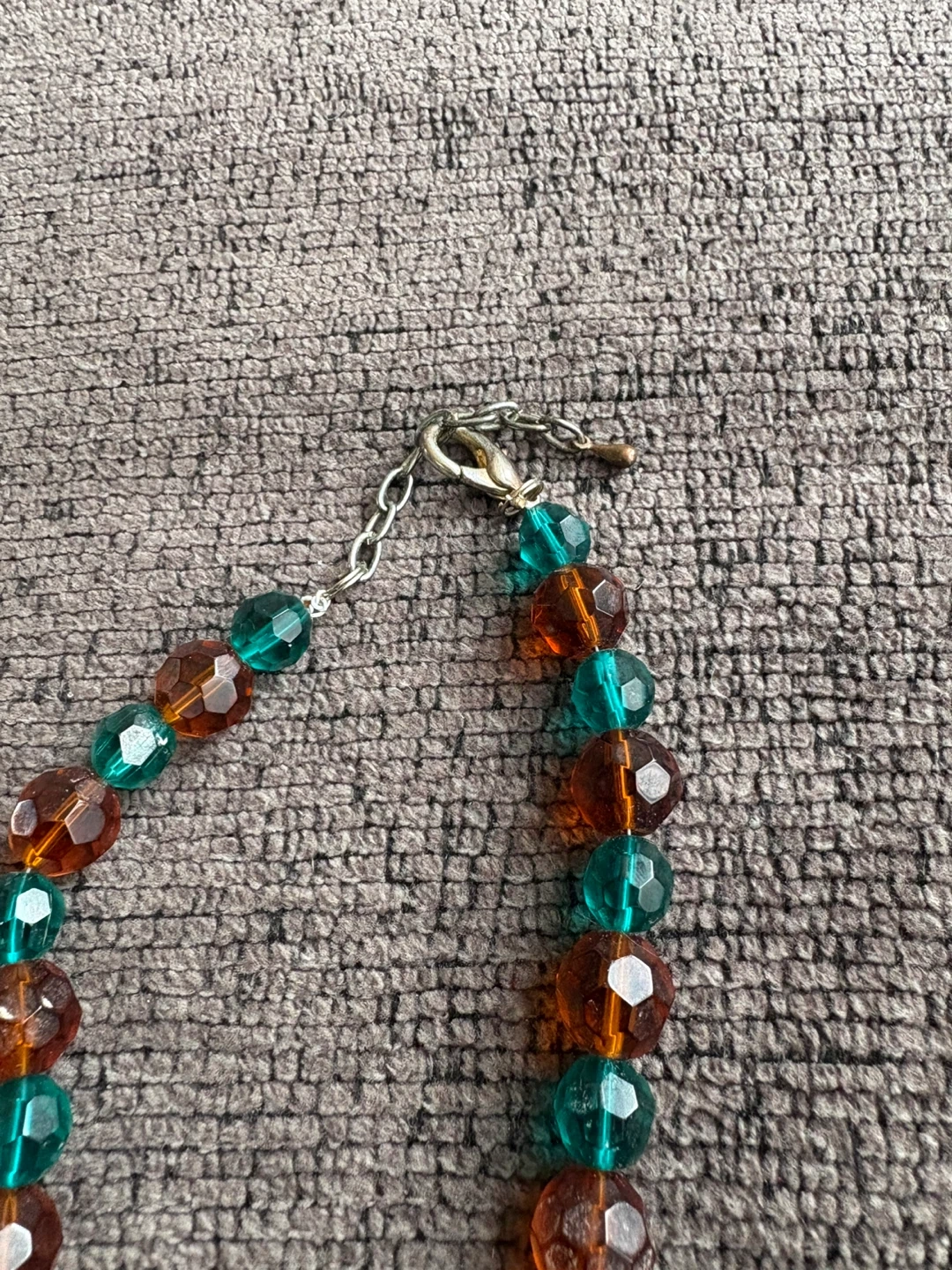 Beautiful beaded necklace featuring a mix of green and amber coloured beads. It's in great condition and ready to add a pop of colour to any outfit!