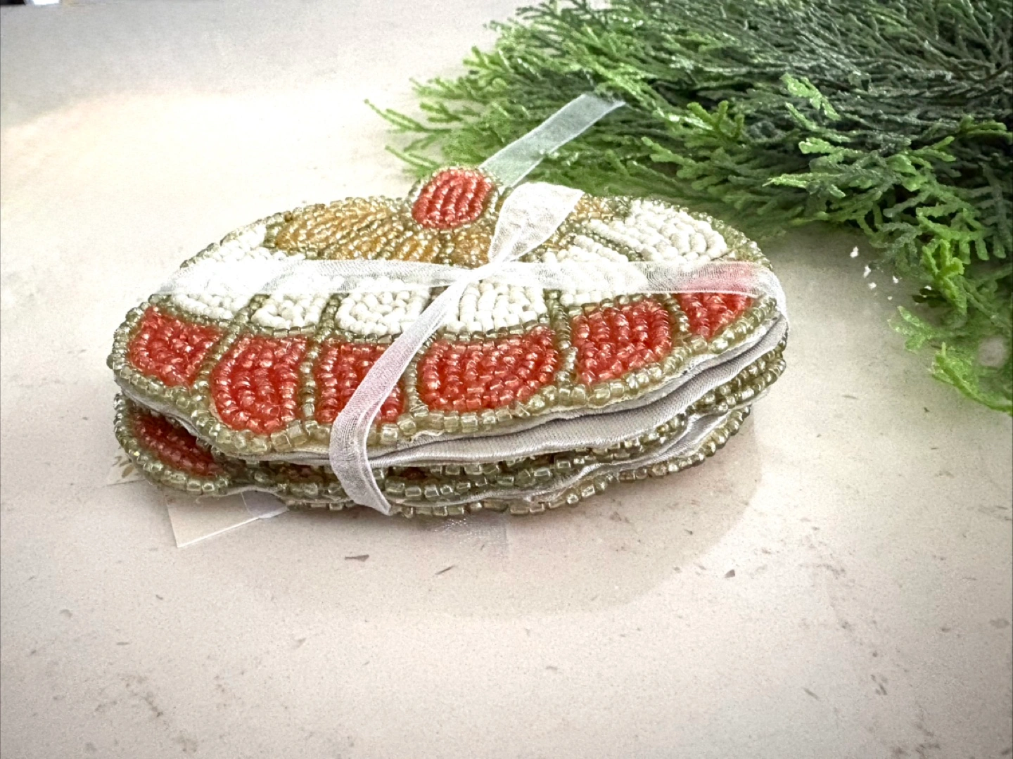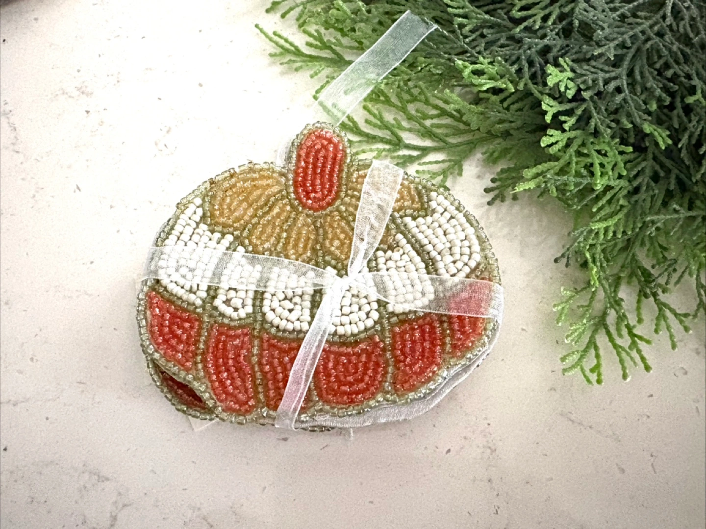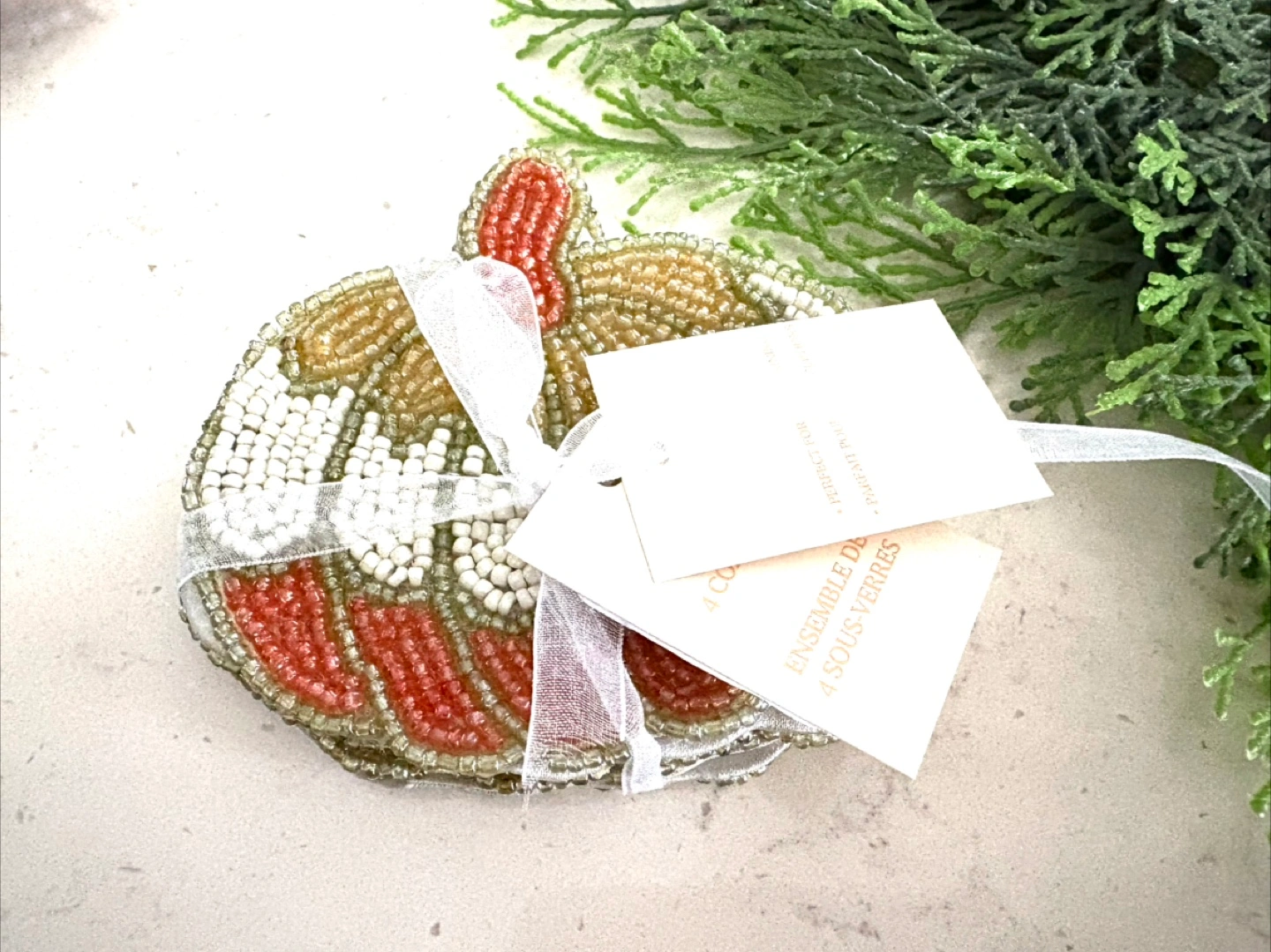 Add a touch of autumn charm to your home with these adorable beaded pumpkin coasters! This set includes four coasters, perfect for protecting your surfaces in style. They feature a lovely beaded design in fall colors, tied with a cute ribbon. Perfect for fall decor. 4.5” x 4”