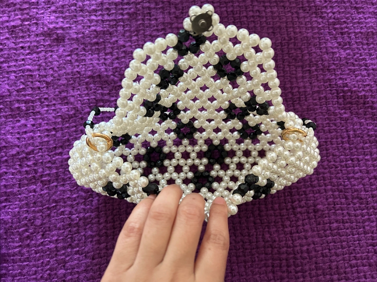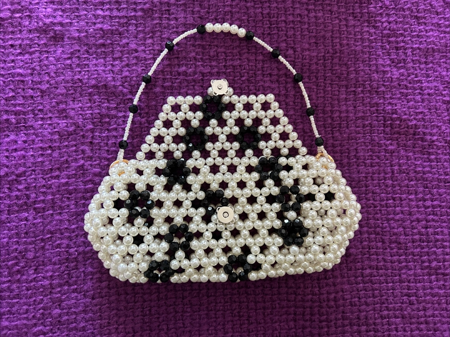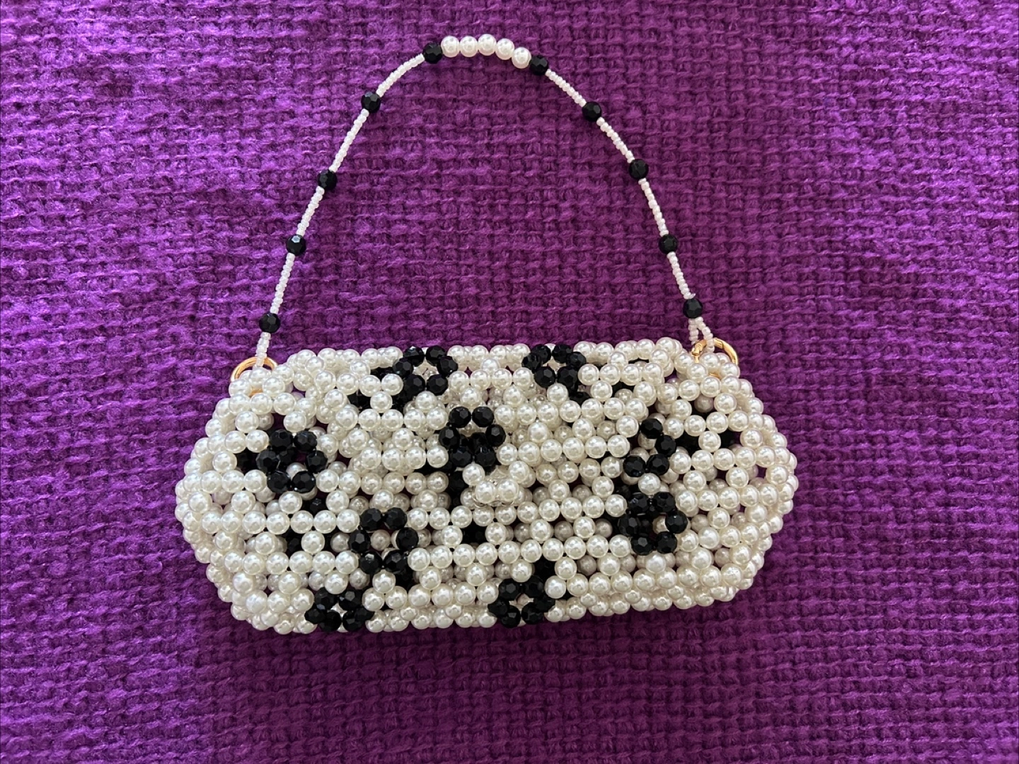 Check out this unique beaded purse! It's got a cool black and white design with pearl-like beads. Perfect for adding a touch of handmade charm to any outfit.