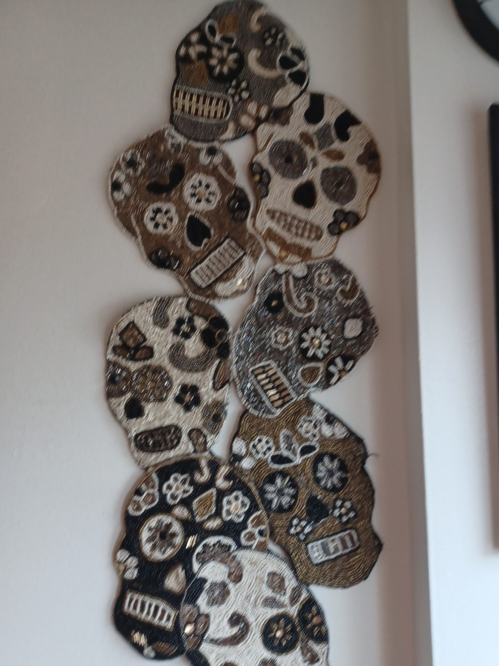 Unique beaded skull wall hanging! Adds a touch of edgy decor to any room. The skulls are intricately designed with various bead patterns and colours, making each one stand out. Perfect for Halloween or year-round display