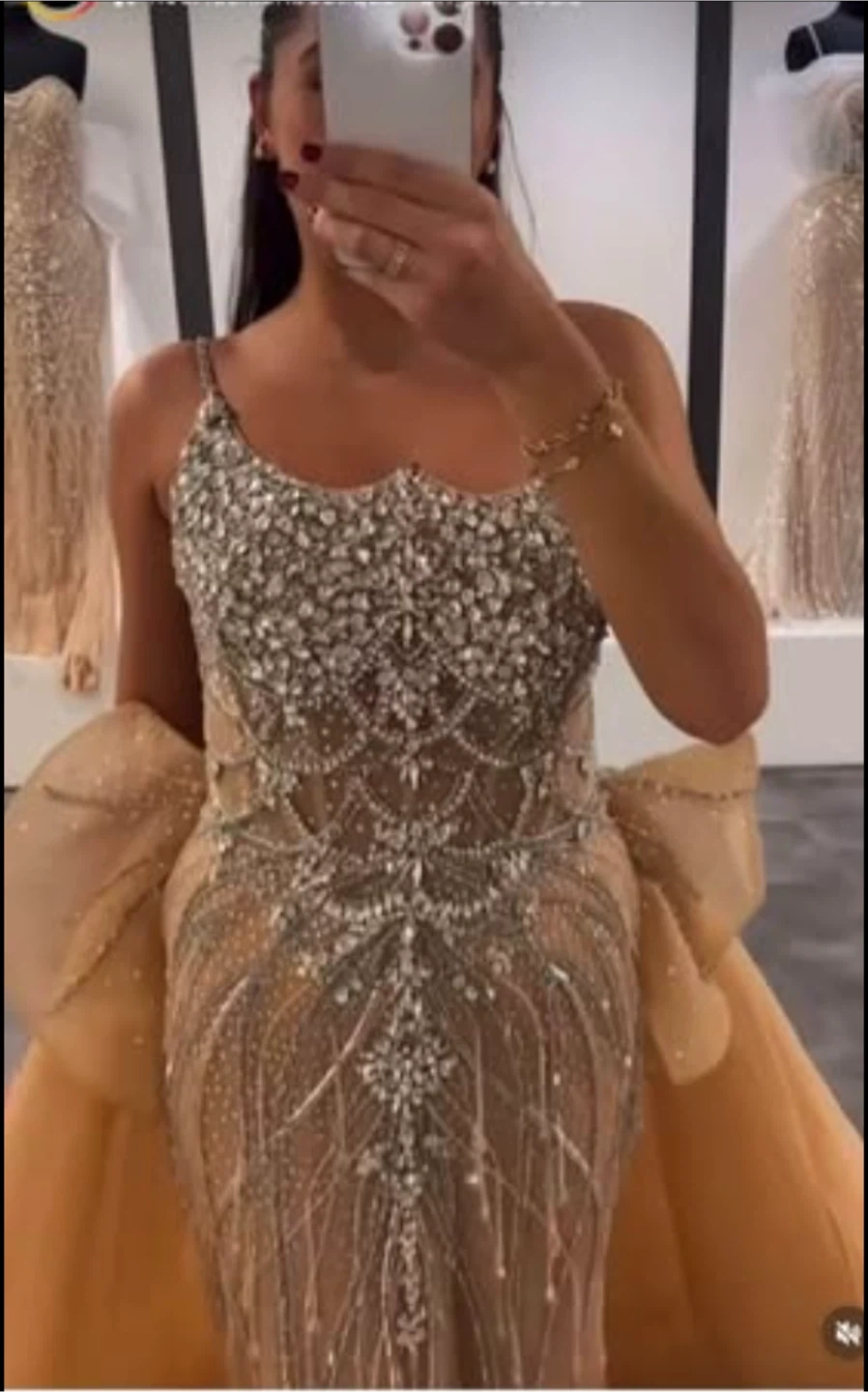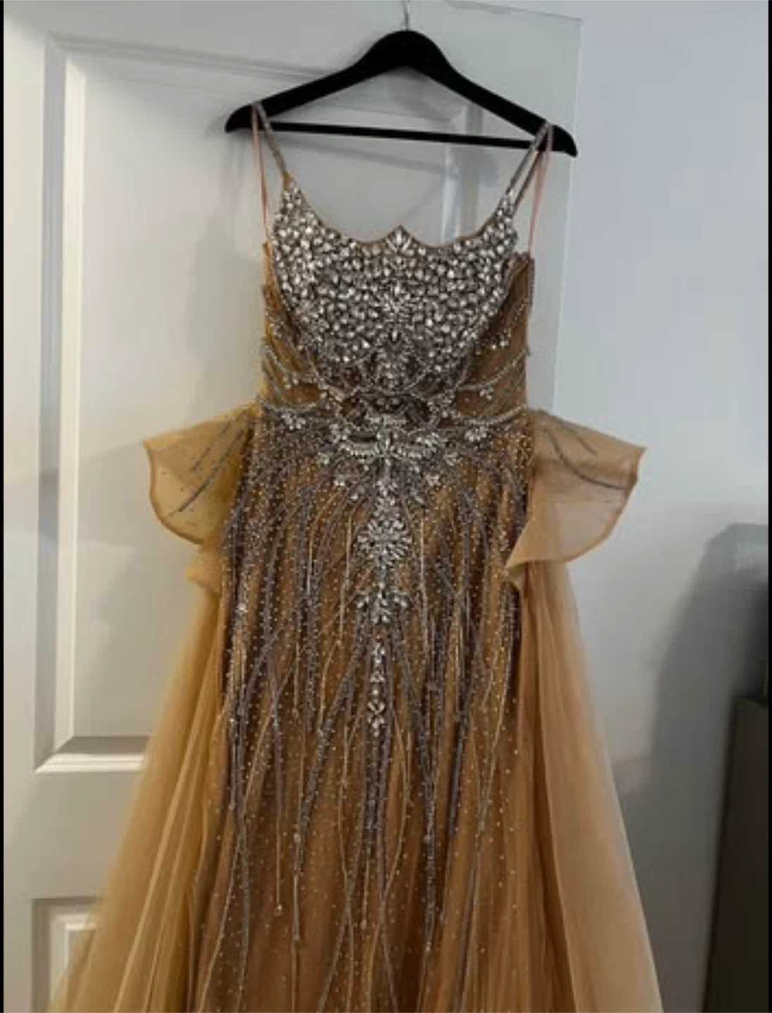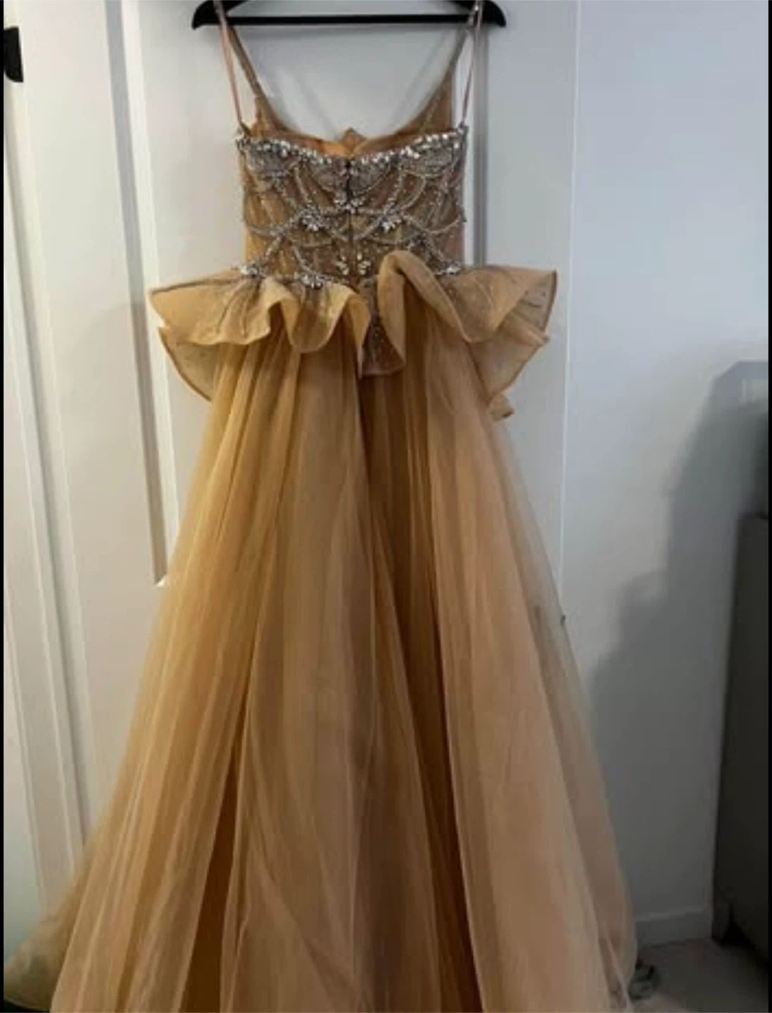 Beautiful evening gown with intricate beading and a flowing tulle skirt. Perfect for a special occasion!