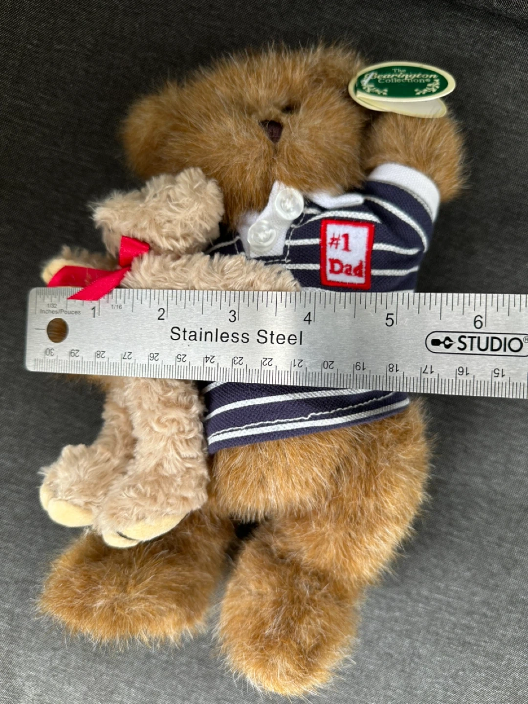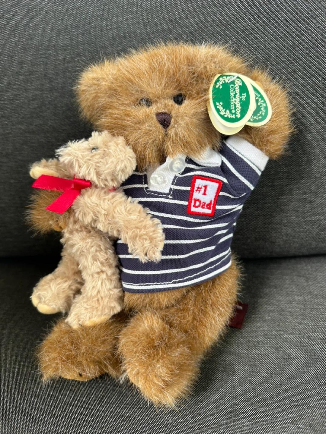 This adorable teddy bear is from the Bearington Collection! It's wearing a cute striped shirt with a '#1 Dad' patch. The bear also comes with a smaller teddy bear friend with a red ribbon. It's in great condition and would make a wonderful gift Self pickup at Coquitlam Parkway Blvd
