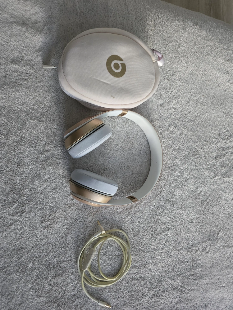 Selling a pair of Beats Solo headphones in gold and white. They come with the original carrying case and cable. Great for listening to music on the go!
